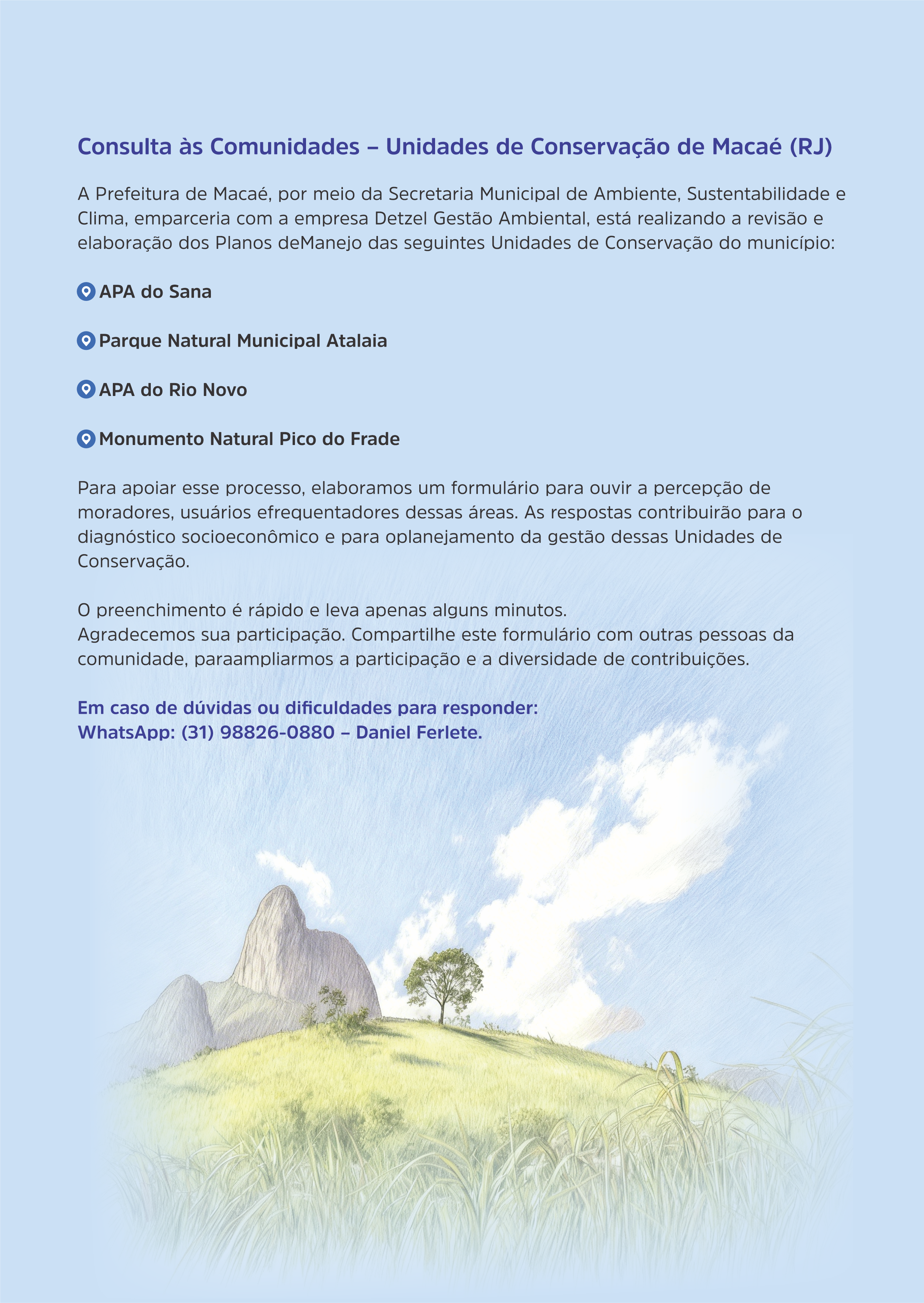 As Unidades de Conservação (UCs) constituem áreas legalmente instituídas com a finalidade de proteger a biodiversidade, os recursos naturais e os ecossistemas, assegurando a conservação ambiental e o uso sustentável de seus atributos. Nesse contexto, por meio do Contrato nº 005/2025, referente à prestação de serviços técnicos especializados firmado com a Secretaria Municipal de Ambiente, Sustentabilidade e Clima e com a Prefeitura Municipal de Macaé, no estado do Rio de Janeiro, a empresa Detzel Gestão Ambiental encontra-se responsável pela revisão dos Planos de Manejo da Área de Proteção Ambiental (APA) do Sana e do Parque Natural Municipal (PNM) Atalaia, bem como pela elaboração dos Planos de Manejo da Área de Proteção Ambiental (APA) Rio Novo e do Monumento Natural (MONA) Pico do Frade.