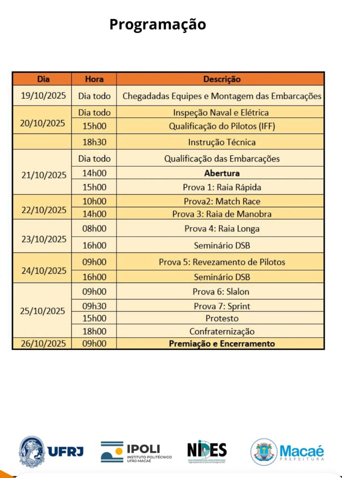 A abertura oficial do "Desafio Solar Brasil 2025" em Macaé será nesta terça-feira (21), às 14h. As competições, que acontecem pela primeira vez no município, começam nesta quarta-feira (22), às 9h. O desafio entre 15 barcos movidos a energia fotovoltaica irá até domingo (26), na Lagoa de Imboassica. O evento é uma realização da Universidade Federal do Rio de Janeiro (UFRJ), com o apoio da Prefeitura de Macaé. A equipe de Fernando Amorim, do barco Carcrá, que representa o Campus UFRJ/Macaé e a cidade, tem boas chances de levar o título de campeã.