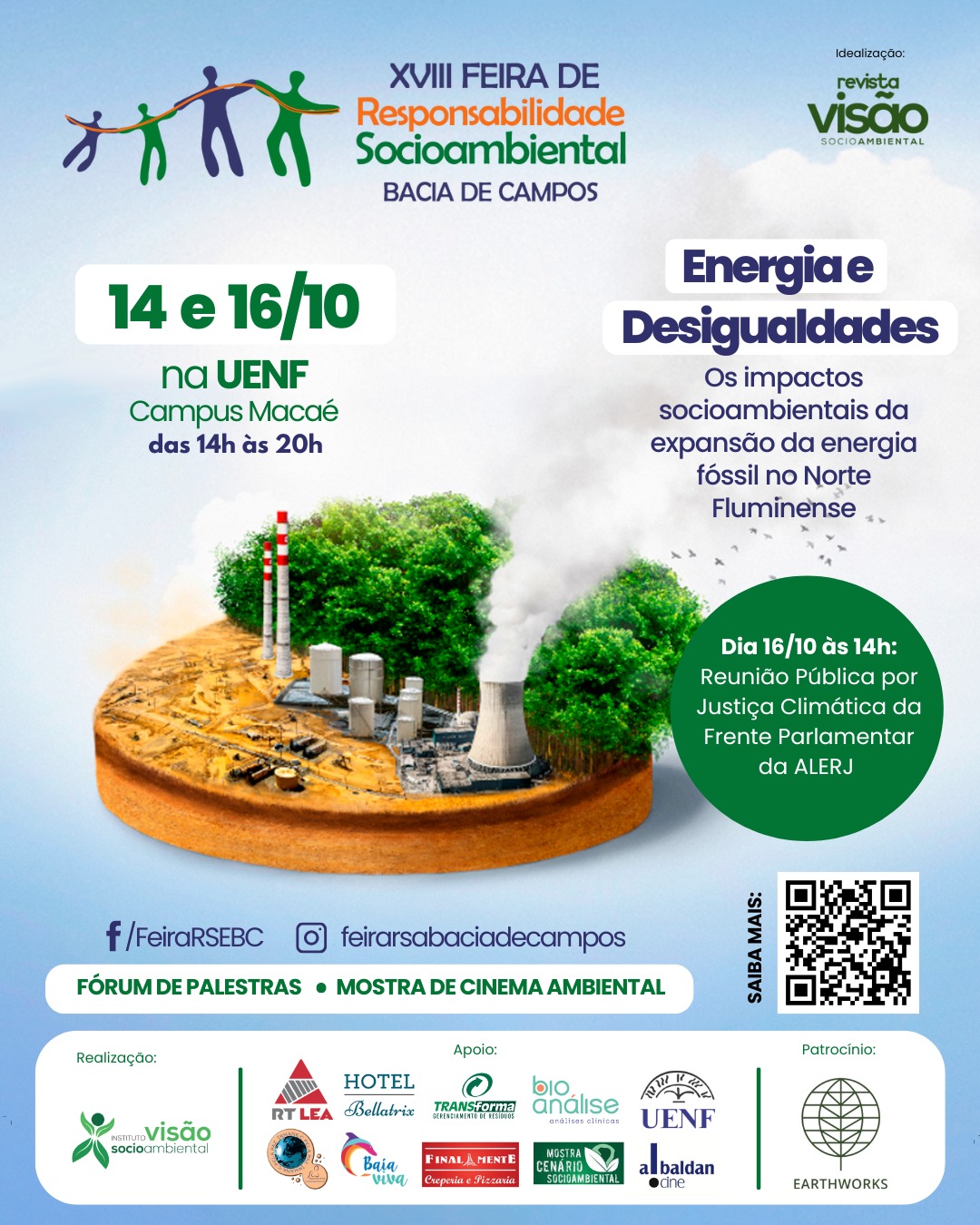 Referência regional na promoção da cultura da sustentabilidade, a 18ª Feira de Responsabilidade Socioambiental, com entrada gratuita, vai acontecer de 14 e 16 de outubro, das 14h às 20h, na Universidade Estadual do Norte Fluminense Darcy Ribeiro (Uenf/Macaé), bairro Imboassica. O tema desta edição será "Os impactos socioambientais da expansão da energia fóssil no Norte Fluminense". A Feira é uma realização do Instituto Visão Socioambiental, com patrocínio da organização não governamental ambientalista com sede em Washington D.C./EUA, Earthworks, e da Al Baldan Cine.