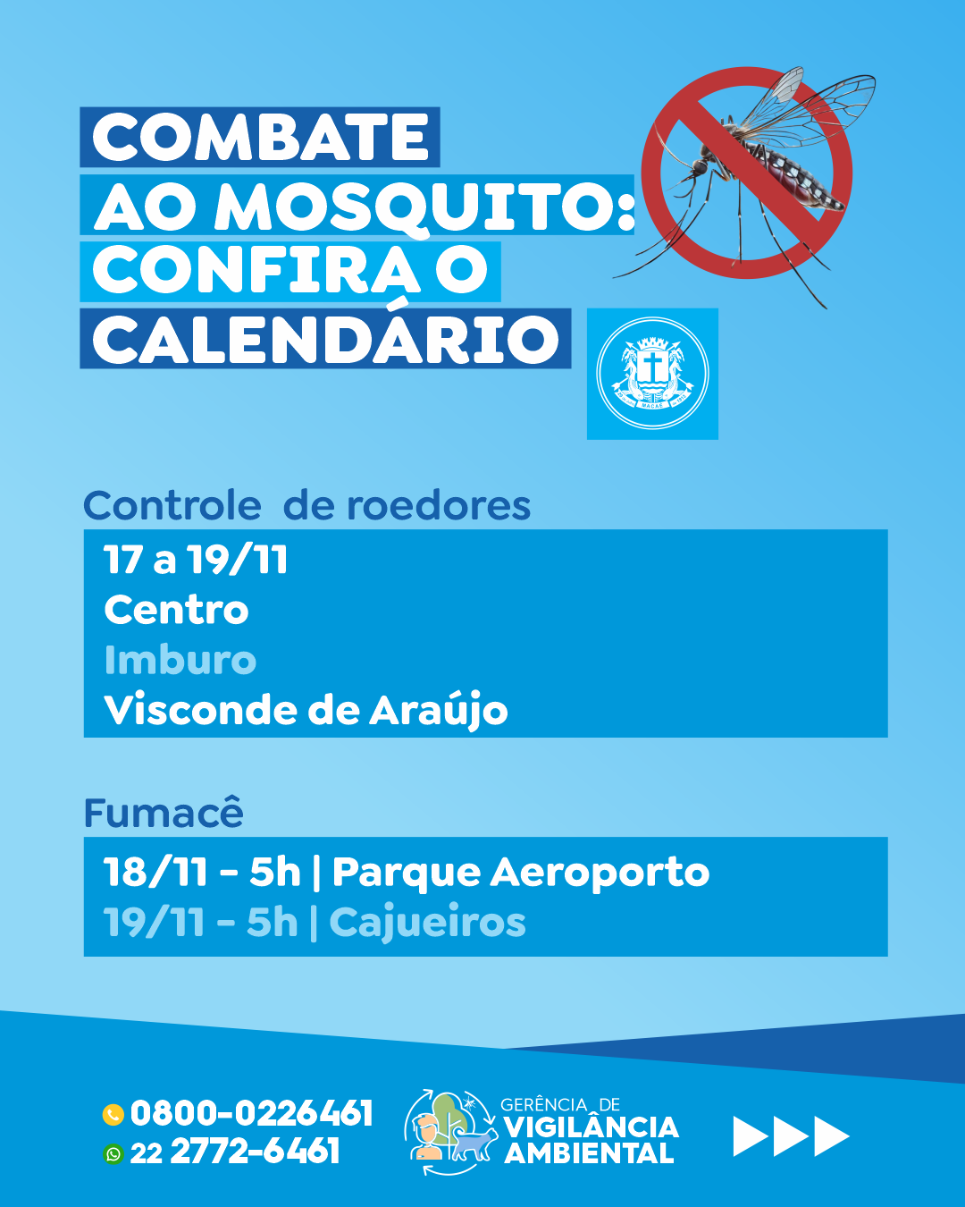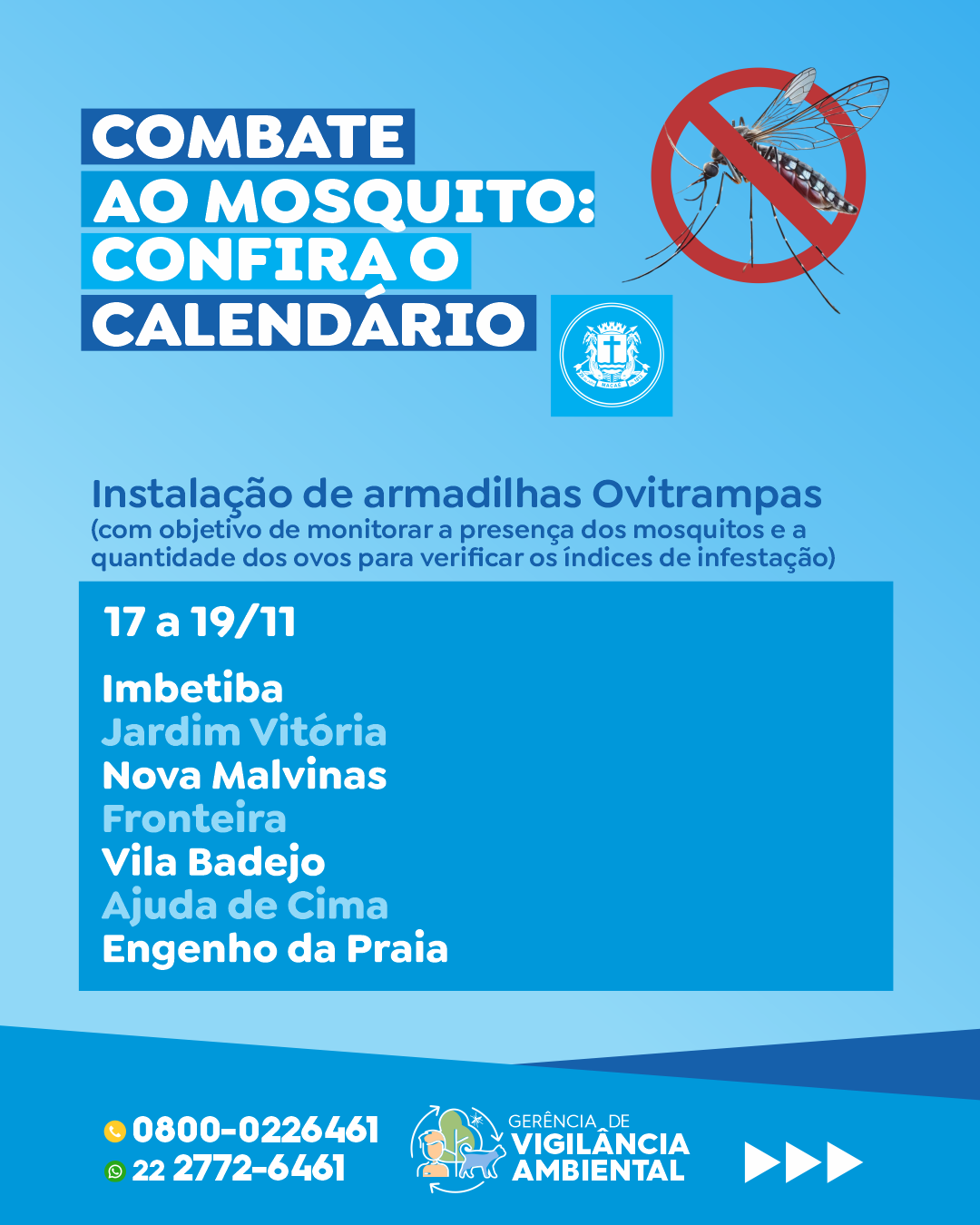 Entre os dias 17 e 19, serão realizadas instalações e monitoramentos de ovitrampas nos bairros Imbetiba, Jardim Vitória, Nova Malvinas, Fronteira, Vila Badejo, Ajuda de Cima e Engenho da Praia