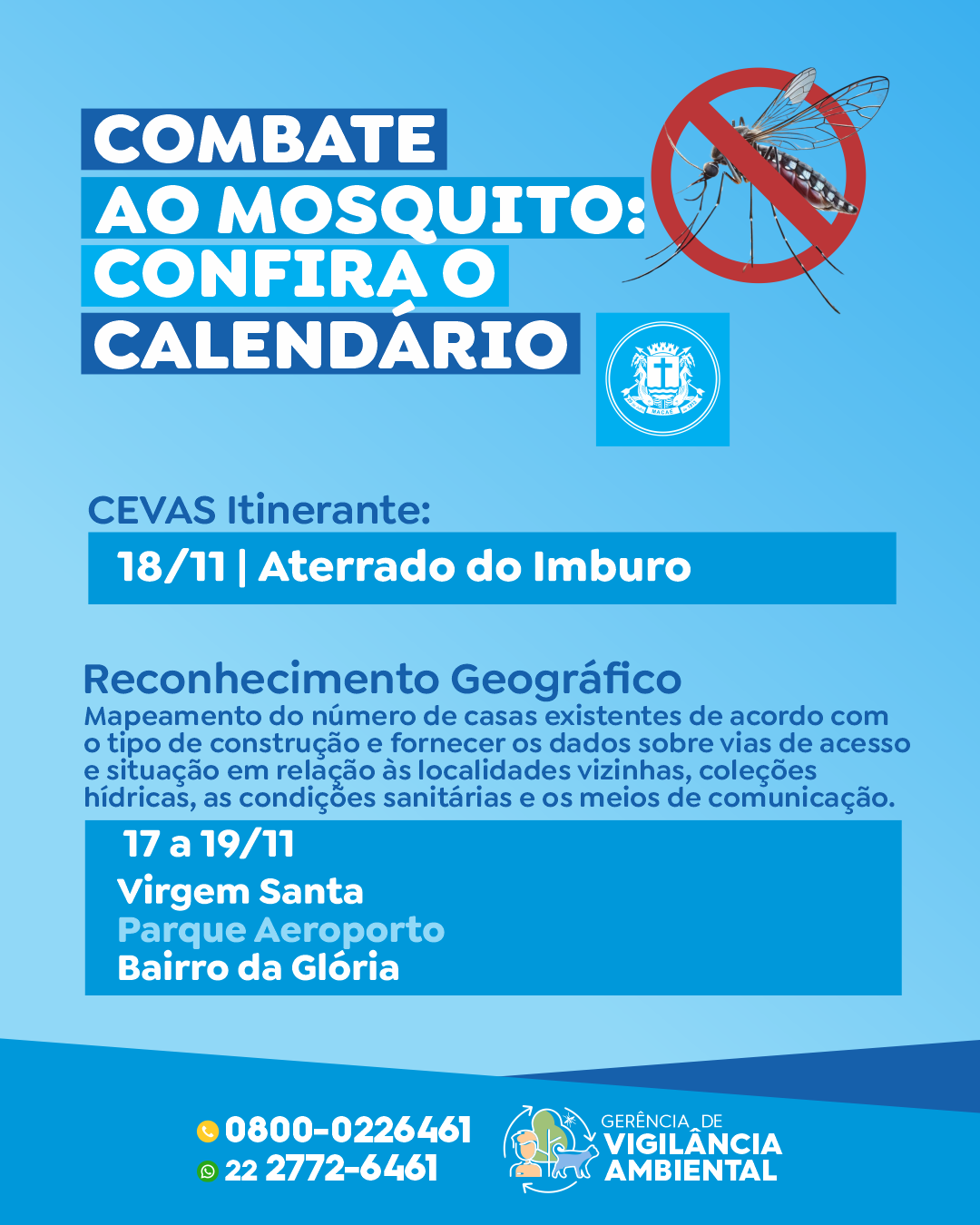 A Prefeitura de Macaé, por meio da Gerência de Vigilância Ambiental da Secretaria de Saúde, continua nesta semana a série de ações integradas de prevenção, controle de vetores e promoção da saúde em diversas localidades do município. Na terça-feira (18), o CEVAS Itinerante estará no Aterrado do Imburo.