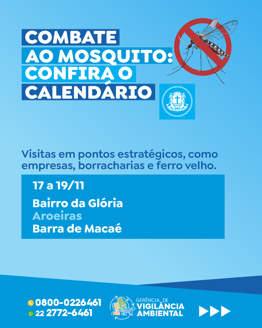 Entre os dias 17 e 19 de novembro de 2025, também serão realizadas visitas técnicas a empresas, borracharias, ferros-velhos e órgãos públicos no Bairro da Glória, Aroeiras e Barra de Macaé. As ações têm como foco a eliminação de possíveis criadouros do mosquito Aedes aegypti e a orientação aos responsáveis sobre o armazenamento adequado de materiais e o descarte correto de resíduos.