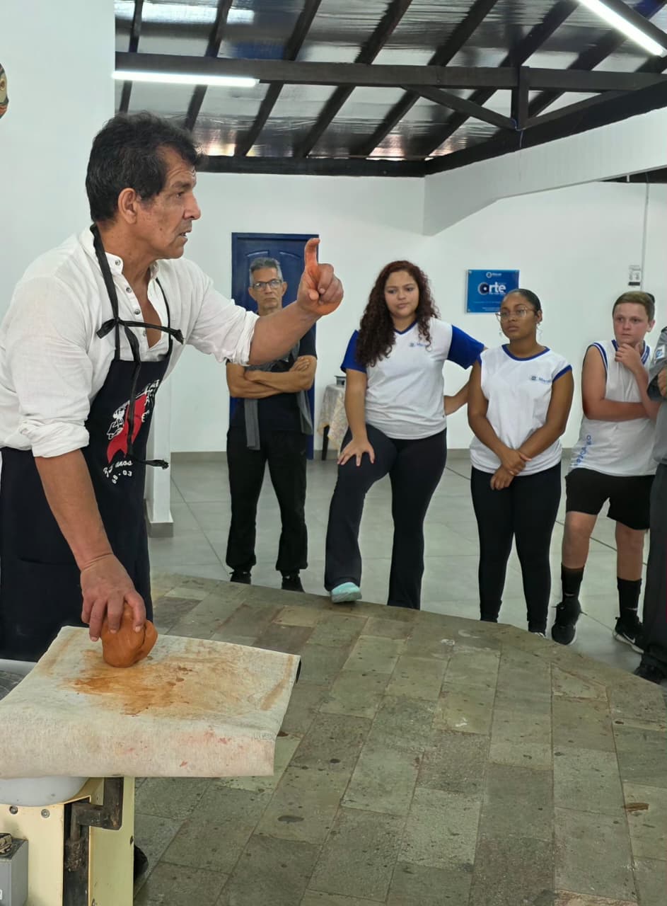 Nesta sexta-feira (27), o espaço recebeu alunos do 9º ano da Escola Municipal Raul Veiga para uma visita guiada. Durante a atividade, o artista apresentou seu processo criativo, realizou uma demonstração de modelagem em argila e compartilhou conhecimentos sobre a produção de peças em cerâmica, aproximando os estudantes do universo das artes visuais.