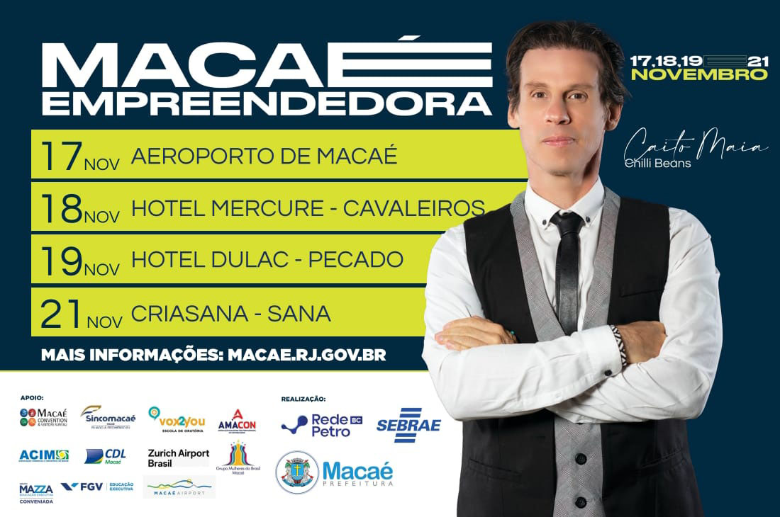 O empresário Caito Maia, fundador da marca Chilli Beans, será o palestrante Master do Macaé Empreendedora, que acontece na terça-feira (18), às 20h, no Hotel Mercure. O evento é uma realização da Prefeitura de Macaé, em parceria com o Sebrae e a Rede Petro Bacia de Campos, e integra a programação que se estende pelos dias 17, 18, 19 e 21 de novembro, reunindo painéis, seminários e rodadas de negócios.