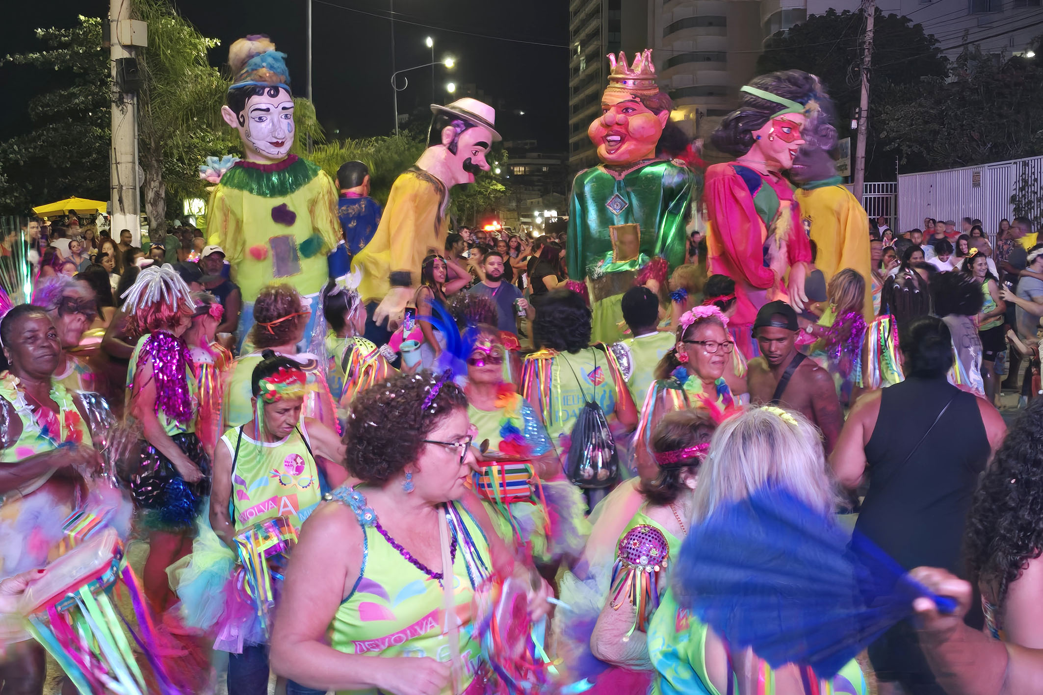 A área da Imbetiba, próxima ao anfiteatro, recebeu o cortejo dos bonecos gigantes, que encantaram a plateia e transformaram o espaço em um verdadeiro espetáculo a céu aberto. Entre registros fotográficos e aplausos, os personagens desfilaram em meio à multidão, ampliando o clima lúdico e festivo da noite. O espaço também contou com o talento do tradicional Bloco do Benê, que trouxe o espírito dos antigos bailes carnavalescos por meio das marchinhas que atravessam gerações. Com fantasias cheias de brilho, paetês, glitter e criatividade, famílias e amigos celebraram o Carnaval em um ambiente de leveza e alegria coletiva. Entre elas estava a educadora Ana Aguiar. “Tudo aqui está lindo. A Imbetiba é um cenário perfeito para o Carnaval. Temos boas memórias e o clima aqui é leve e animado.”