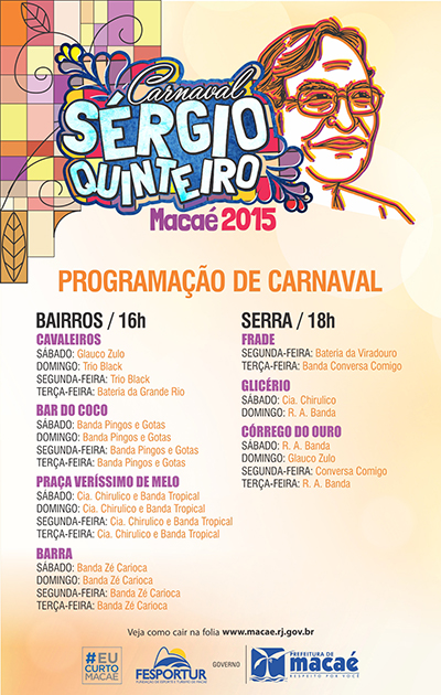- Procuramos montar uma programação variada, voltada para as famílias, com destaque para bandas conhecidas e queridas da cidade e algumas participações especiais. Nesse momento em que a crise econômica da região se mistura à alegria do Carnaval, nada melhor que valorizar os nossos talentos. Temos certeza de que o Carnaval será um sucesso e de que o público terá boas opções para celebrar o feriado de forma descontraída e com segurança na cidade -, destacou o Secretário de Governo, Leonardo Gomes.