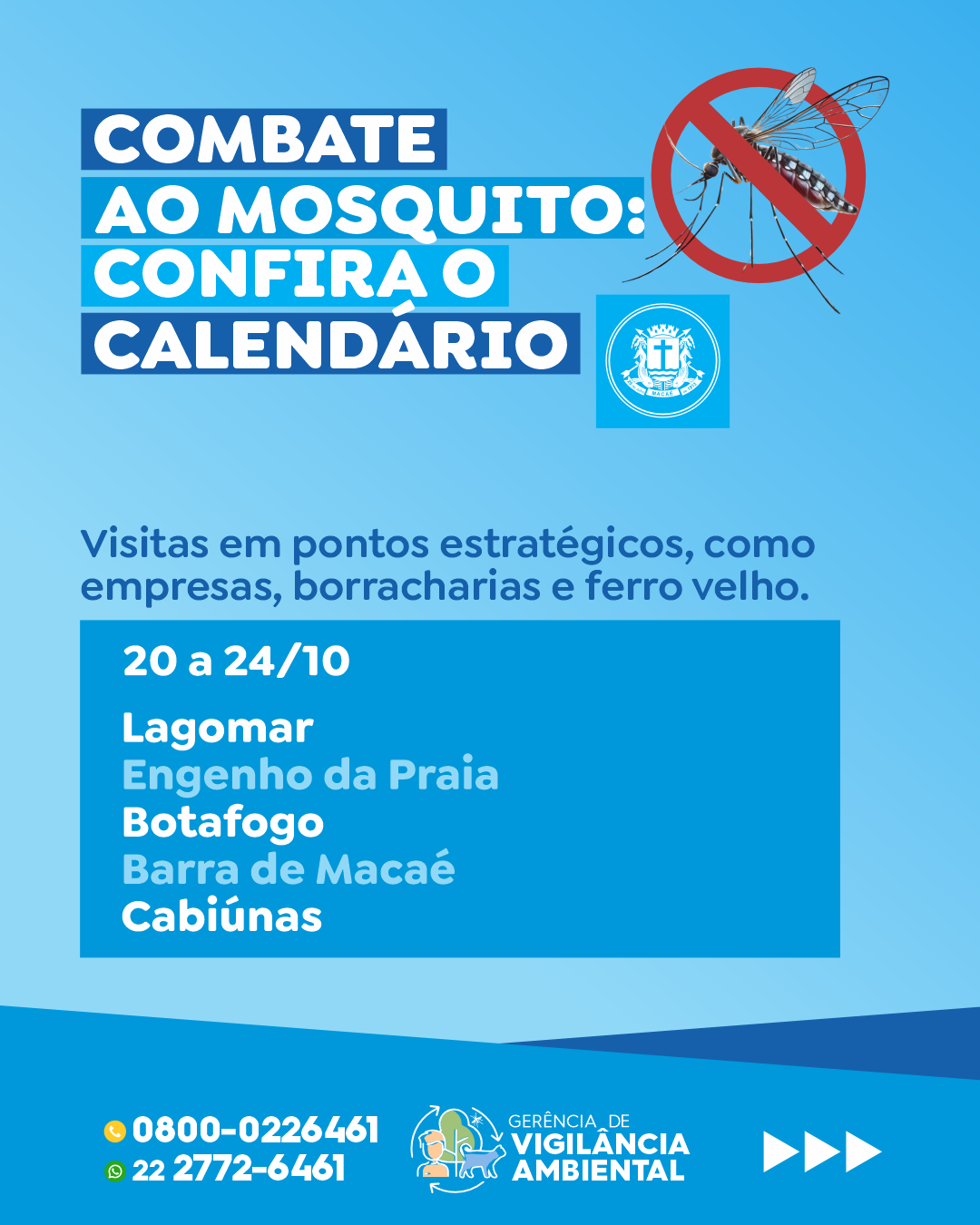 As ações incluem também visitas em pontos estratégicos como empresas, borracharias, ferros velhos e órgãos públicos. A equipe estará entre os dias 20 e 24 nos bairros Lagomar, Engenho da Praia, Botafogo, Barra de Macaé e Cabiúnas. Já a atualização do reconhecimento geográfico se concentrará no Centro e na Virgem Santa.