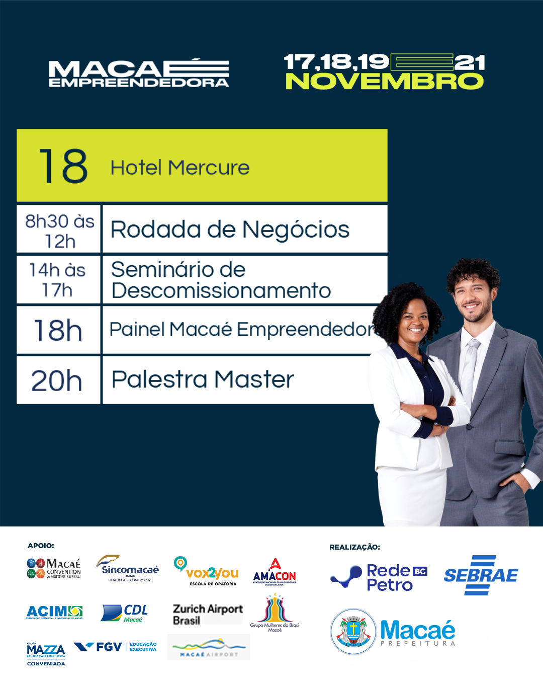 O segundo dia da Semana Macaé Empreendedora será marcado por uma ampla programação no bairro dos Cavaleiros, no Hotel Mercure. As atividades começam pela manhã, com uma rodada de negócios promovida pelo Sebrae em parceria com a Rede Petro Bacia de Campos. Estarão presentes no dia 18 Erika Mendes da Âmbar; o Russo, do Restaurante do Russo e Helena Maltez da X-Live.