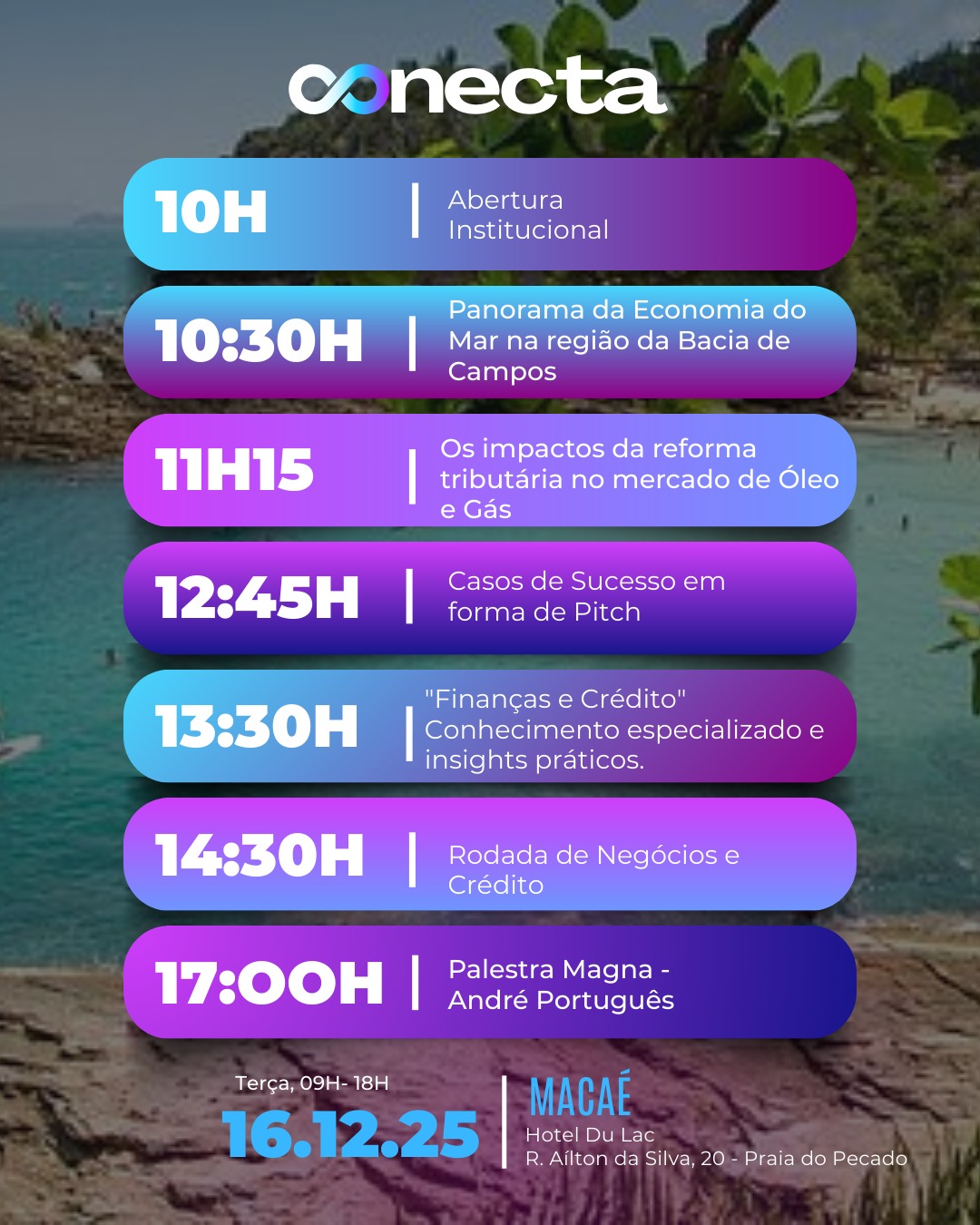 O Conecta Macaé tem como objetivo fortalecer o ecossistema de negócios local por meio de palestras, workshops e rodadas de negócios, promovendo conexões estratégicas e oportunidades reais de parceria.As inscrições são gratuitas e podem ser feitas pelo link: https://www.sympla.com.br/evento/conecta-macae/3233249