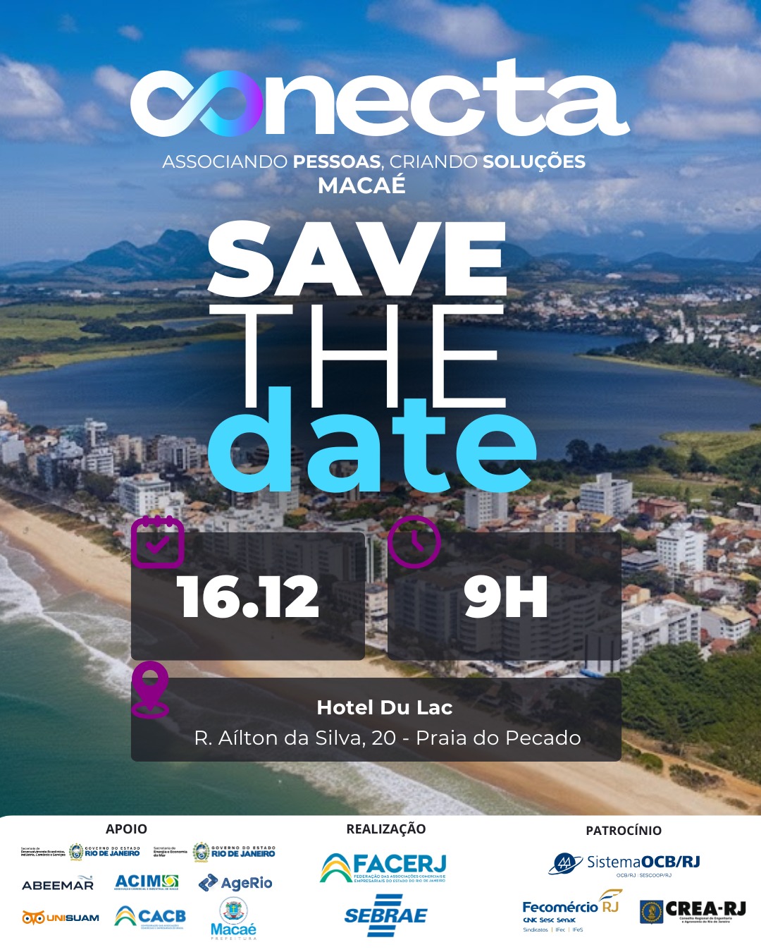 A cidade de Macaé vai sediar, no dia 16 de dezembro, a partir das 9h, o Conecta, evento realizado pela Federação das Associações Comerciais e Empresariais do Estado do Rio de Janeiro (FACERJ) em parceria com o Sebrae/RJ. A iniciativa busca reunir empreendedores, líderes e representantes de empresas em um ambiente voltado à inovação, colaboração e desenvolvimento econômico. O encontro tem o apoio da Prefeitura.