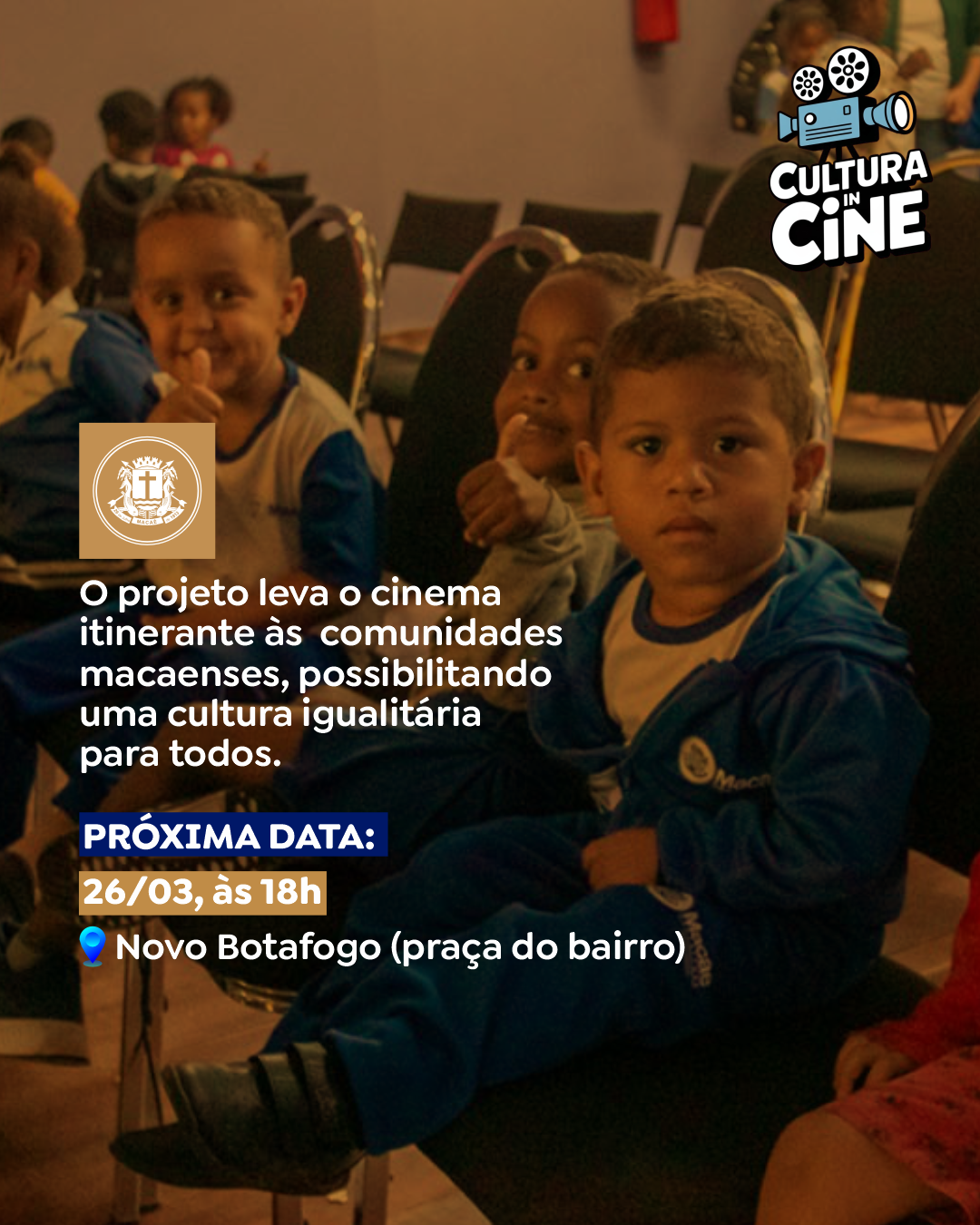 Quem gosta de um bom filme, não pode deixar de prestigiar o Projeto “Cultura In Cine”, idealizado pela Secretaria de Cultura. O objetivo do projeto é levar o cinema itinerante em comunidades macaenses, fomentar a cultura e fazer políticas públicas de inclusão e qualidade possibilitando uma cultura igualitária para todos. A próxima edição acontecerá na quinta-feira (26), às 18h, na Praça do Novo Botafogo. A entrada é gratuita.