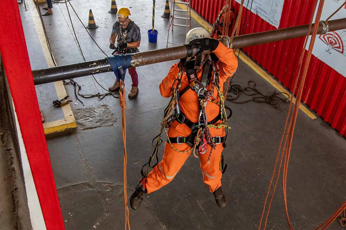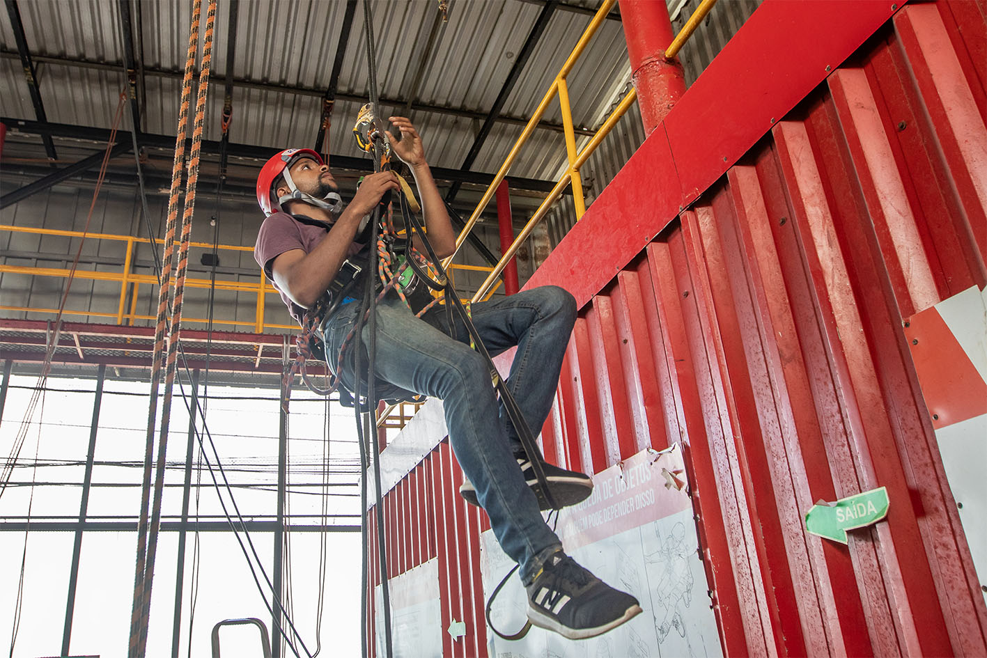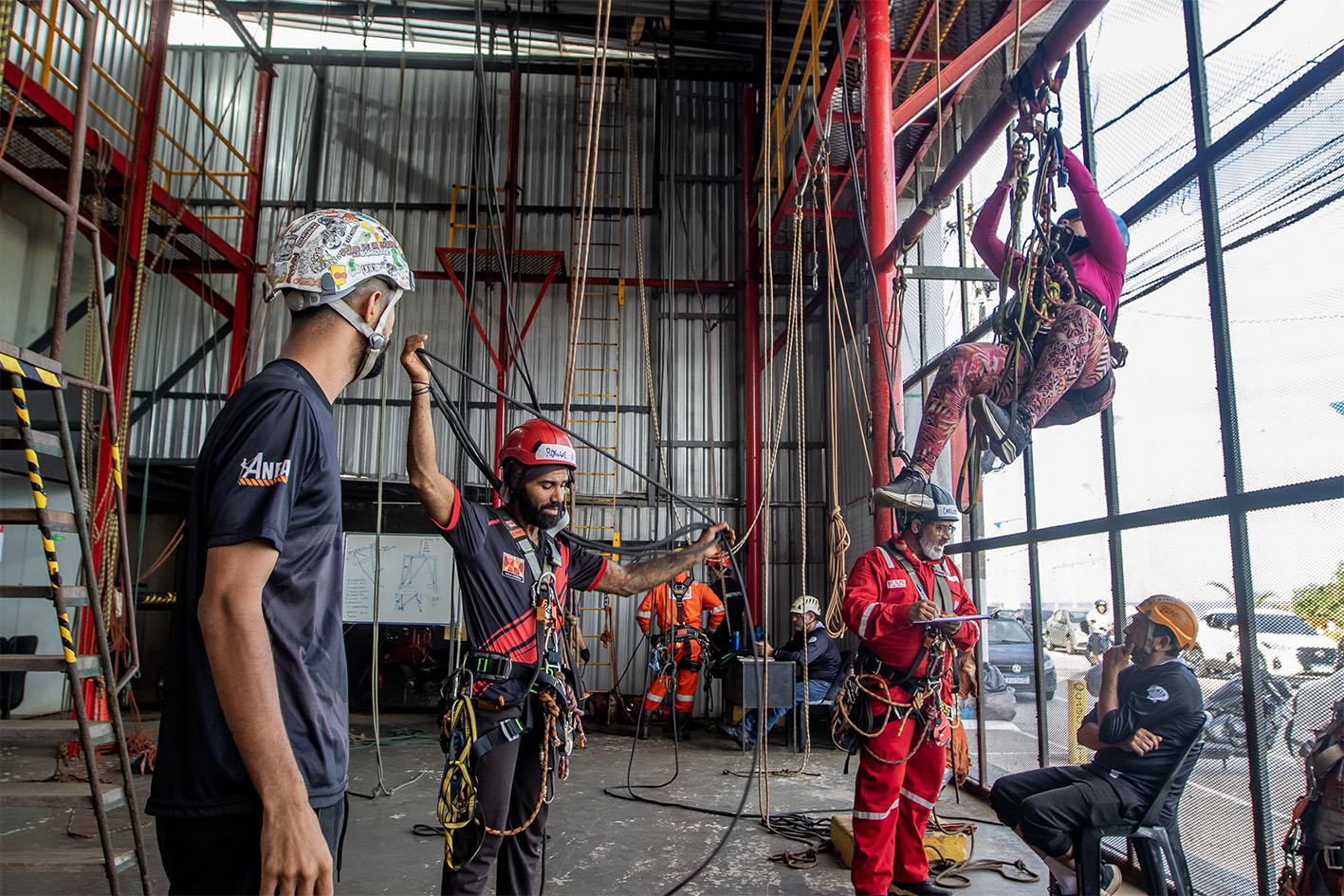 Cordas, mosquetões e equipamentos de proteção individual fazem parte das aulas práticas do curso de Acesso por Cordas. A turma Nível 1 (N1) também é inclusiva e conta com muita coragem e vontade de vencer. Diante das aulas teóricas e práticas, que abrangem conhecimentos básicos de normas, habilidade e concentração, os alunos aprendem tarefas em altura sob supervisão, montar sistemas de acesso, realizar resgates e trabalhos com cordas de forma segura e a utilizar equipamentos. Deivid Correa, de 40 anos, salientou que estar na aula é a realização de um sonho antigo. “Tenho três filhos e esse curso tem um valor mais alto. Sou muito grato à prefeitura. Temos que nos qualificar para conseguir melhores ocupações”, disse o pintor hidrojatista morador da Barra.