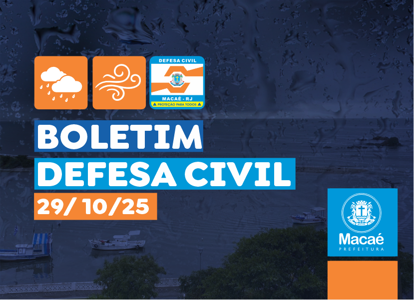 A Defesa Civil de Macaé informa que, entre quarta-feira (29) e quinta-feira (30), a passagem de uma frente fria poderá provocar pancadas de chuvas moderadas a fortes. De acordo com o Instituto Nacional de Meteorologia (INMET), são esperados acumulados entre 30 e 60 mm/h ou 50 e 100mm/dia, além de ventos intensos.