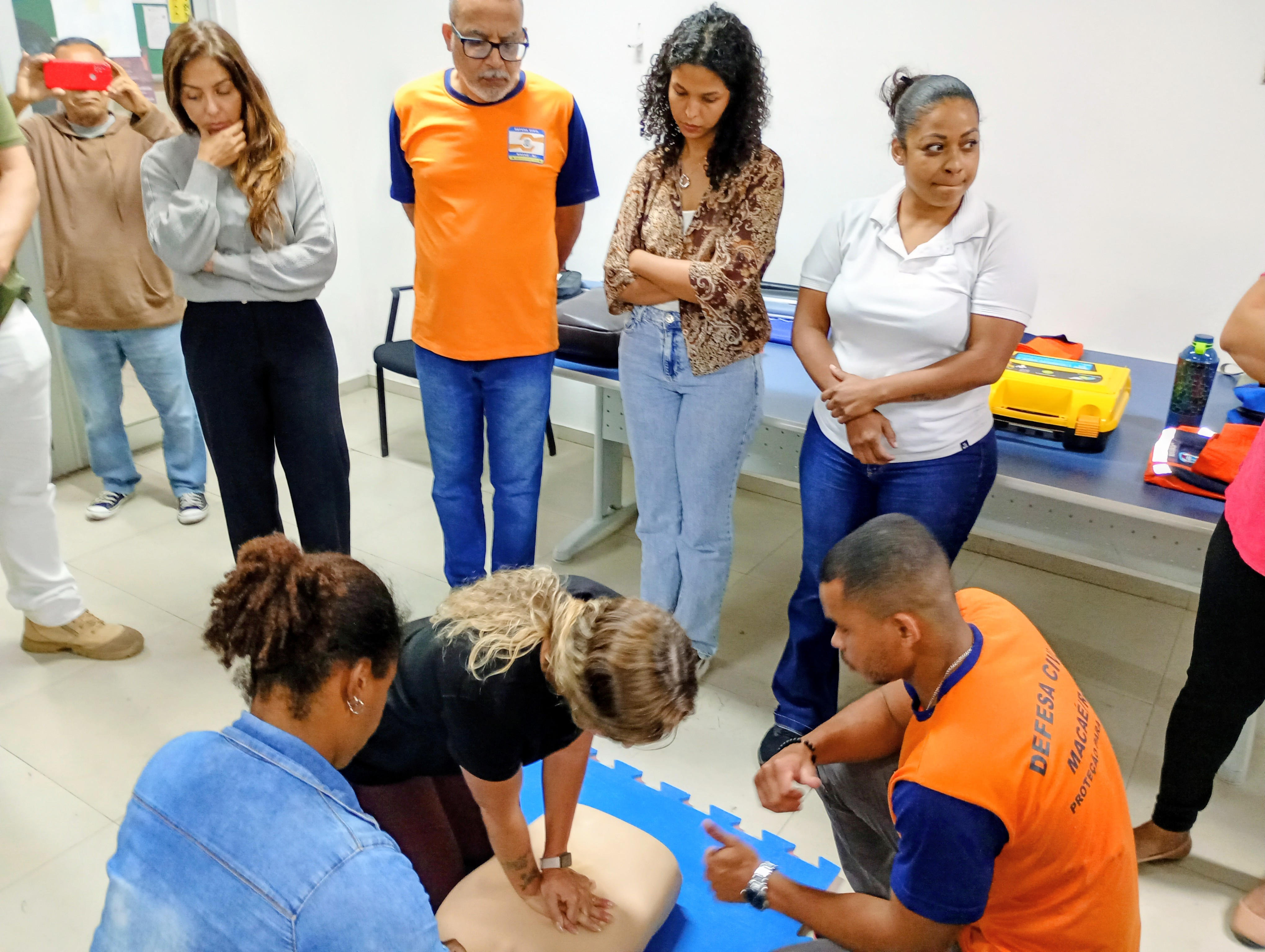 Os participantes do curso de formação de voluntários da Defesa Civil tiveram, nesta quarta-feira (1º), uma aula prática de primeiros socorros na Cidade Universitária. A atividade reuniu alunos que colocaram em prática técnicas essenciais para o atendimento em situações de emergência, como engasgo, desmaio, convulsões, hemorragias e reanimação cardiopulmonar (RCP). A capacitação tem como objetivo preparar os voluntários para atuar de forma rápida e segura em ocorrências do dia a dia ou em grandes desastres.