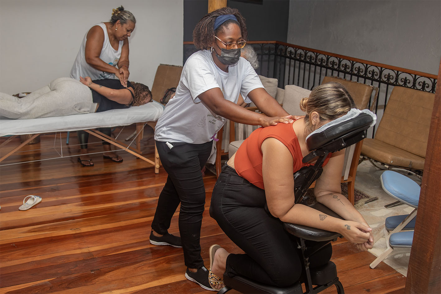 A massoterapeuta que também é artesã, Miriam Pereira, conta que ofereceu a Quick Massage para os artesãos.