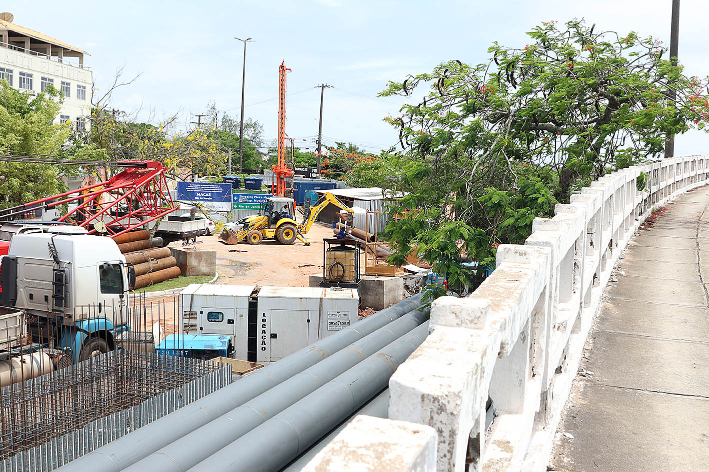 A obra de duplicação da ponte Ivan Mundim, que liga o Centro da cidade ao bairro Barra de Macaé, entrou em nova fase esta semana. Novos equipamentos e máquinas chegaram ao canteiro e estão sendo levados para uma balsa no Rio Macaé. O objetivo é iniciar a perfuração dos pilares centrais. Não há interrupção da empreitada em dias chuvosos e nem haverá no período de festas de fim de ano.
