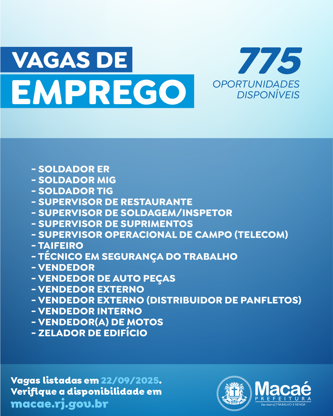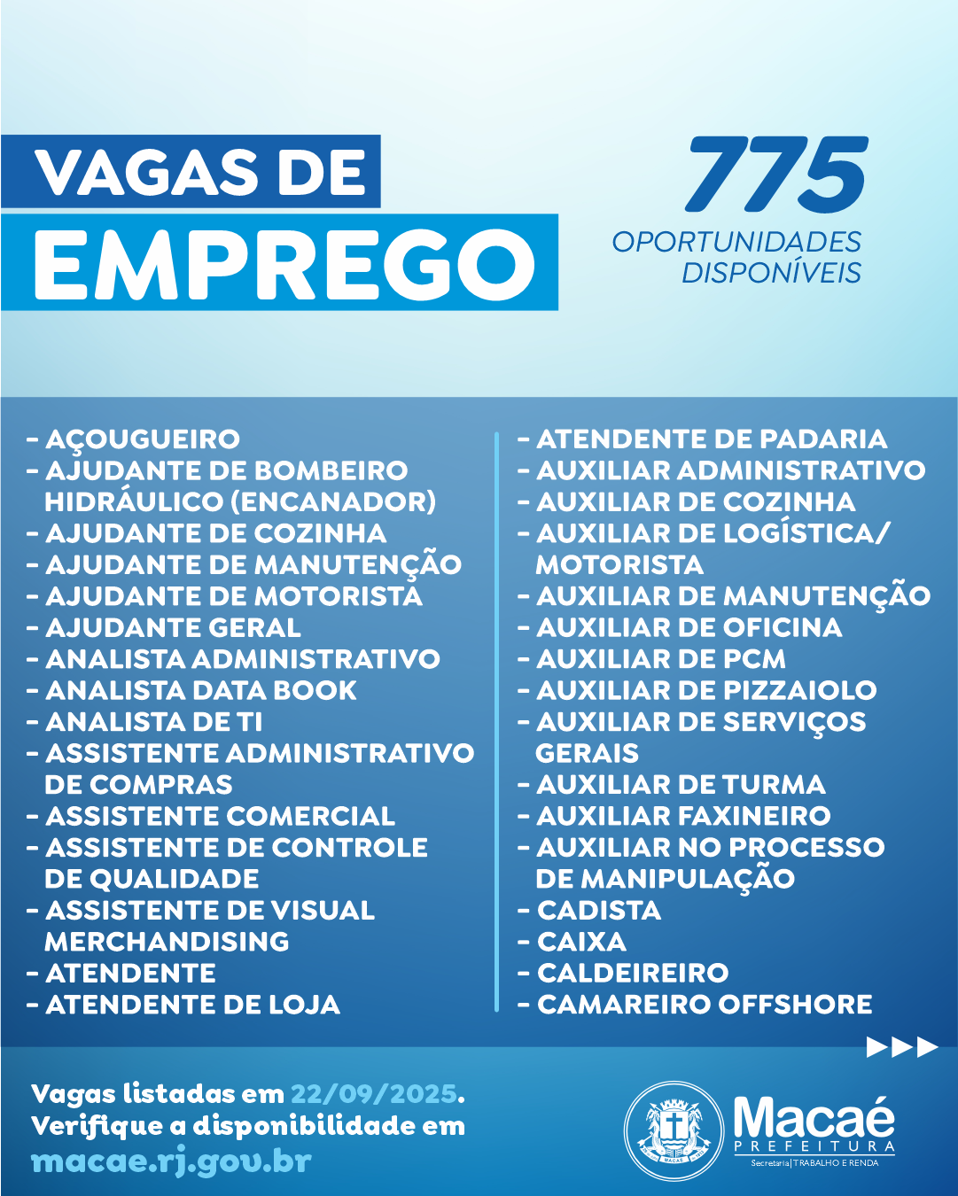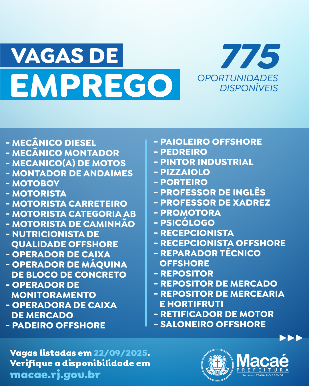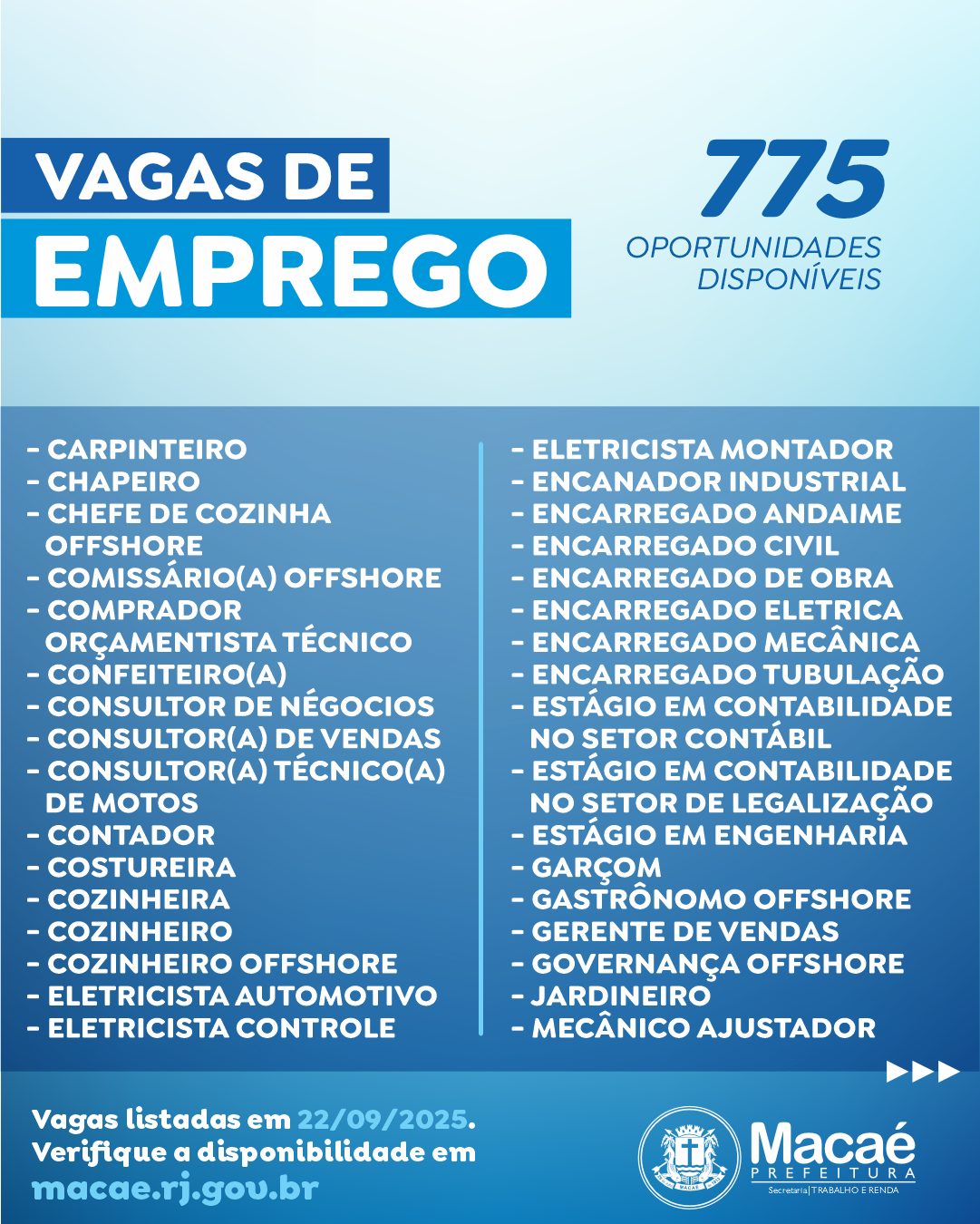 Setecentos e setenta e cinco oportunidades de emprego são divulgadas, nesta semana, pela Central do Trabalhador, da Prefeitura de Macaé. Para quem pretende entrar no mercado offshore, há oportunidades atraentes: 100 vagas são para camareiro, 25 para chefe de cozinha, 25 para cozinheiro, 25 para governança, 25 para padeiro, 20 para comissário, 20 para paioleiro, 04 para gastrônomo, 05 para nutricionista de qualidade, entre outros.