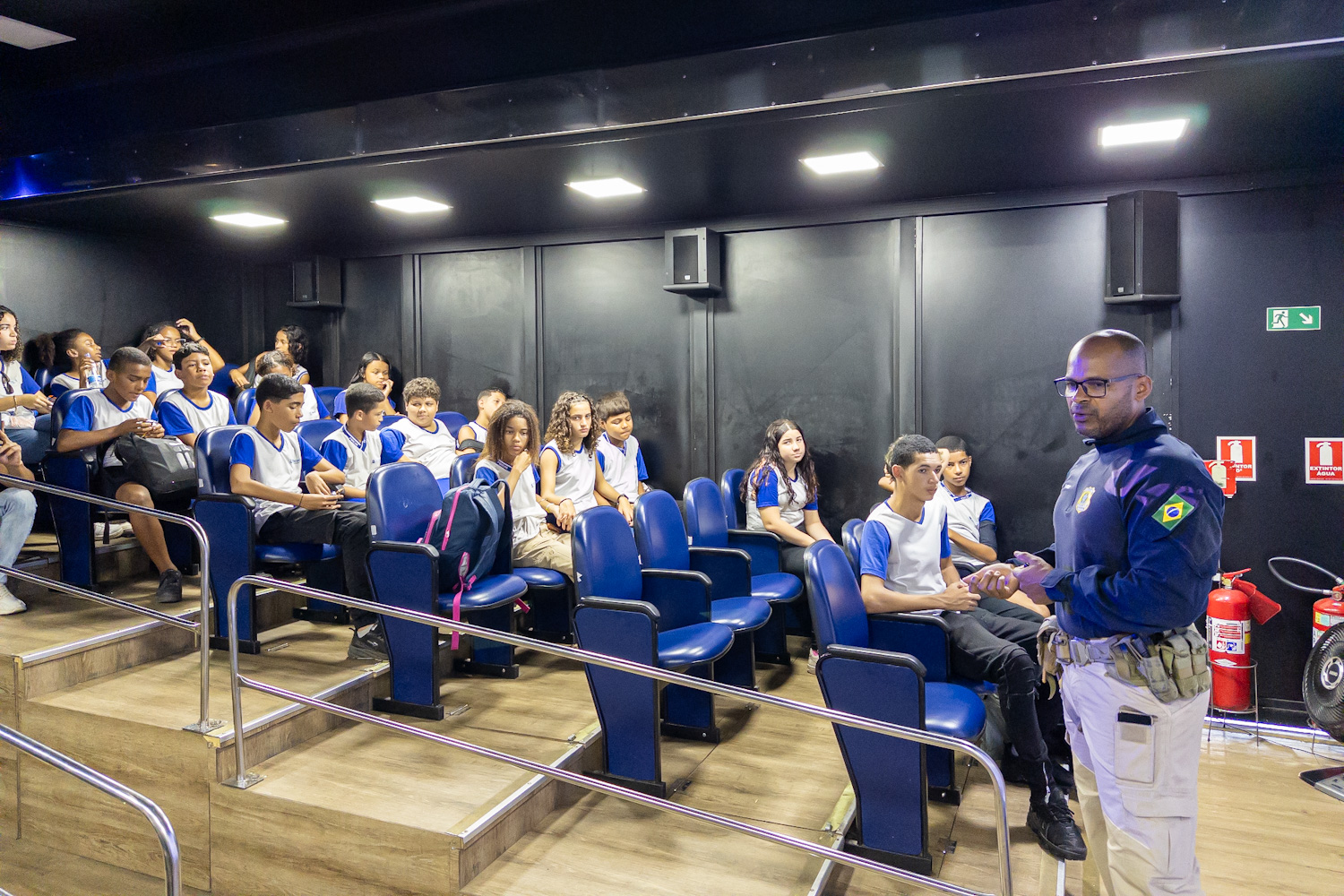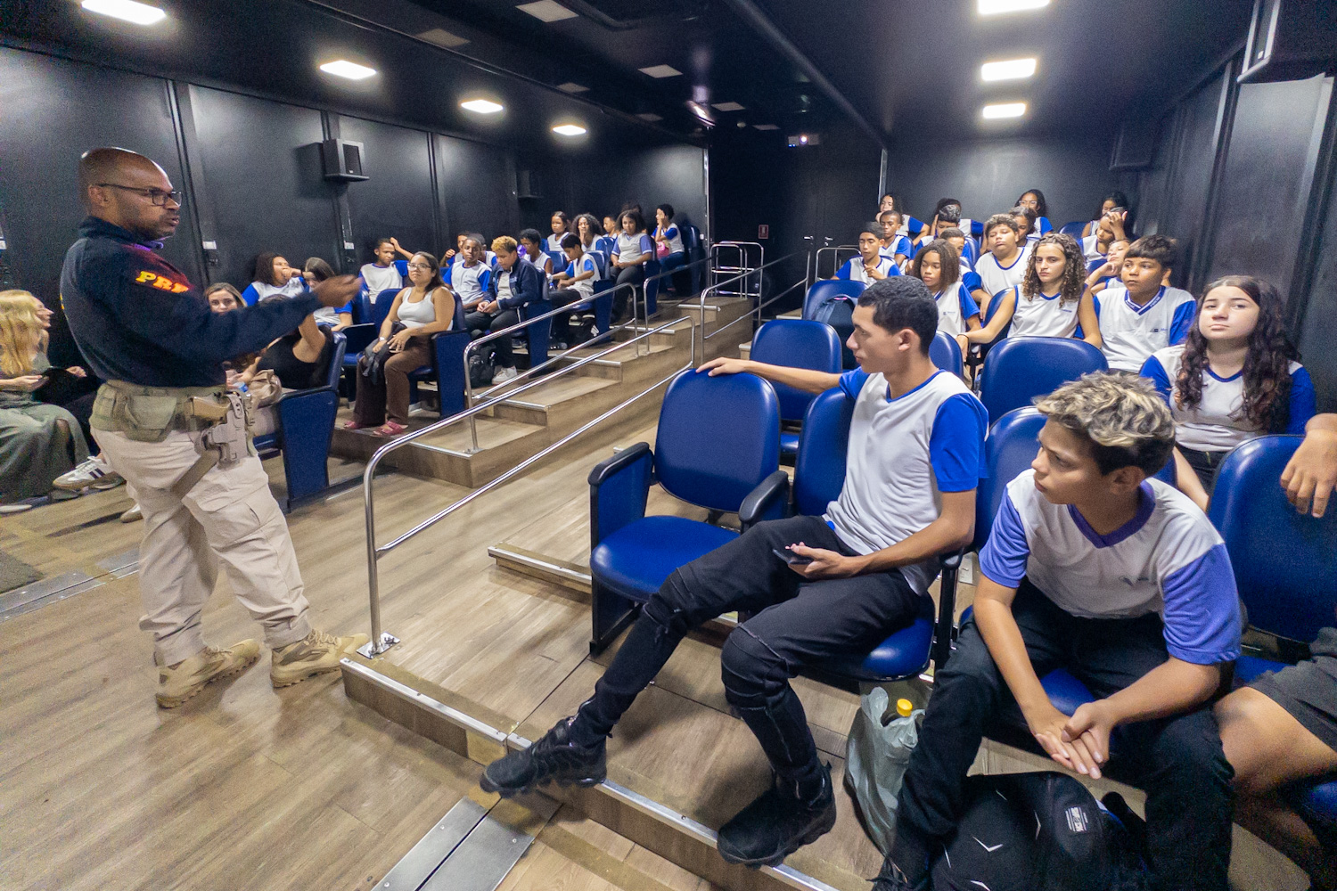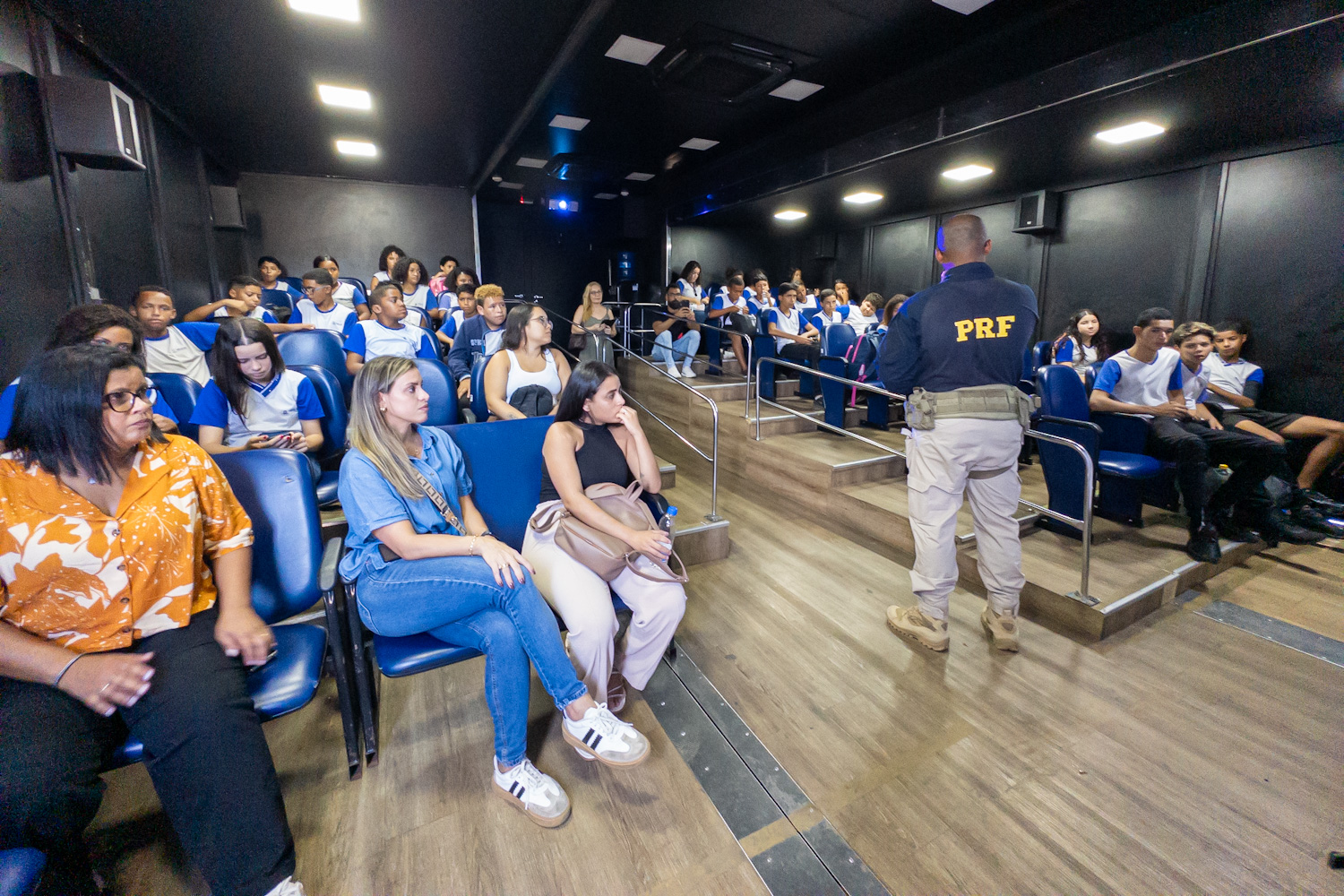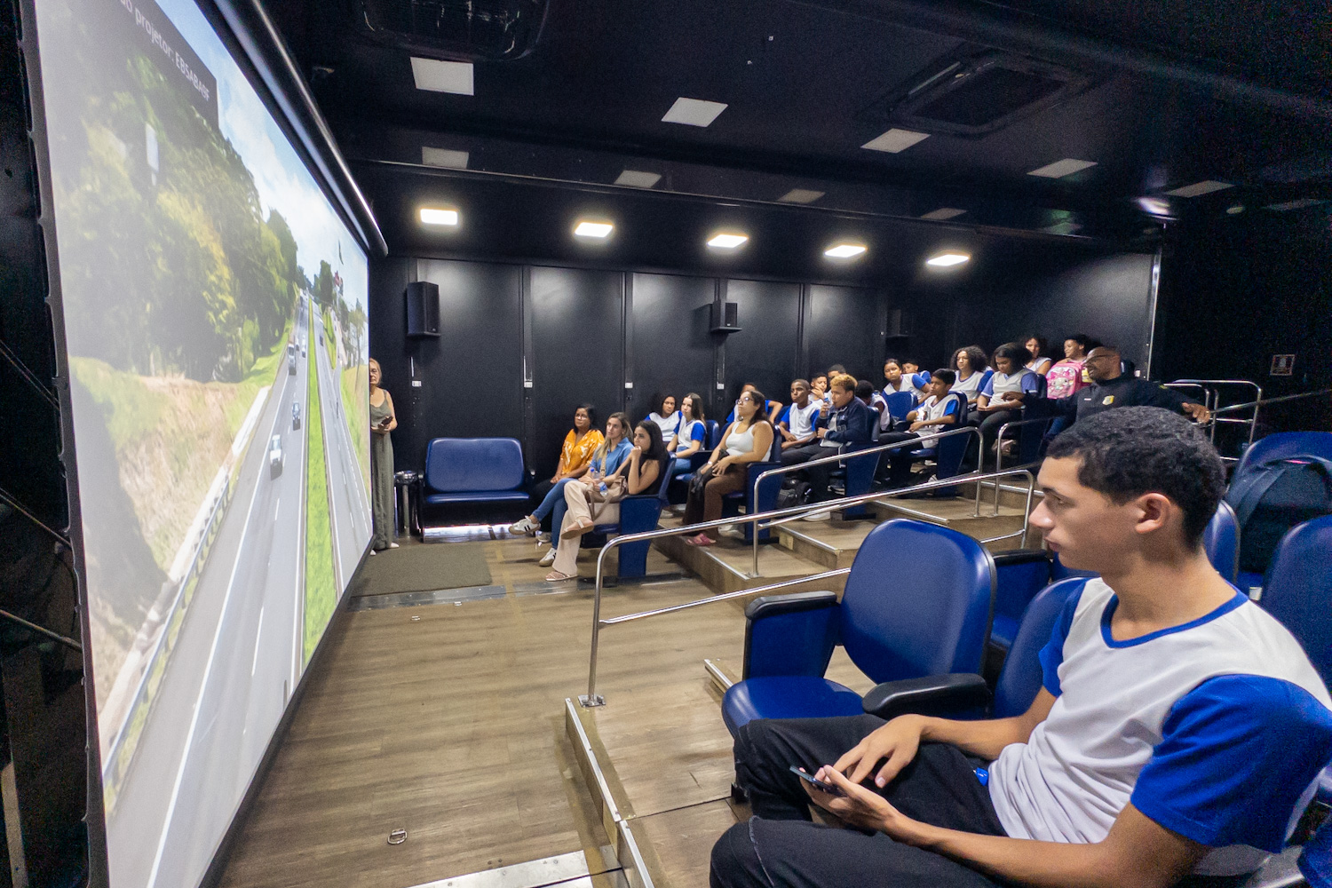 A sala de cinema com ar-condicionado dentro da carreta tem capacidade para cerca de 48 pessoas. Os vídeos e a palestra apresentados buscam conscientizar o público para o comportamento responsável de pedestres, ciclistas e futuros condutores, reforçando a necessidade de uso de cinto de segurança para todos e em todos os tipos de veículos e de capacete para motociclistas e ciclistas, além de alertar para o perigo do uso de celulares no trânsito.