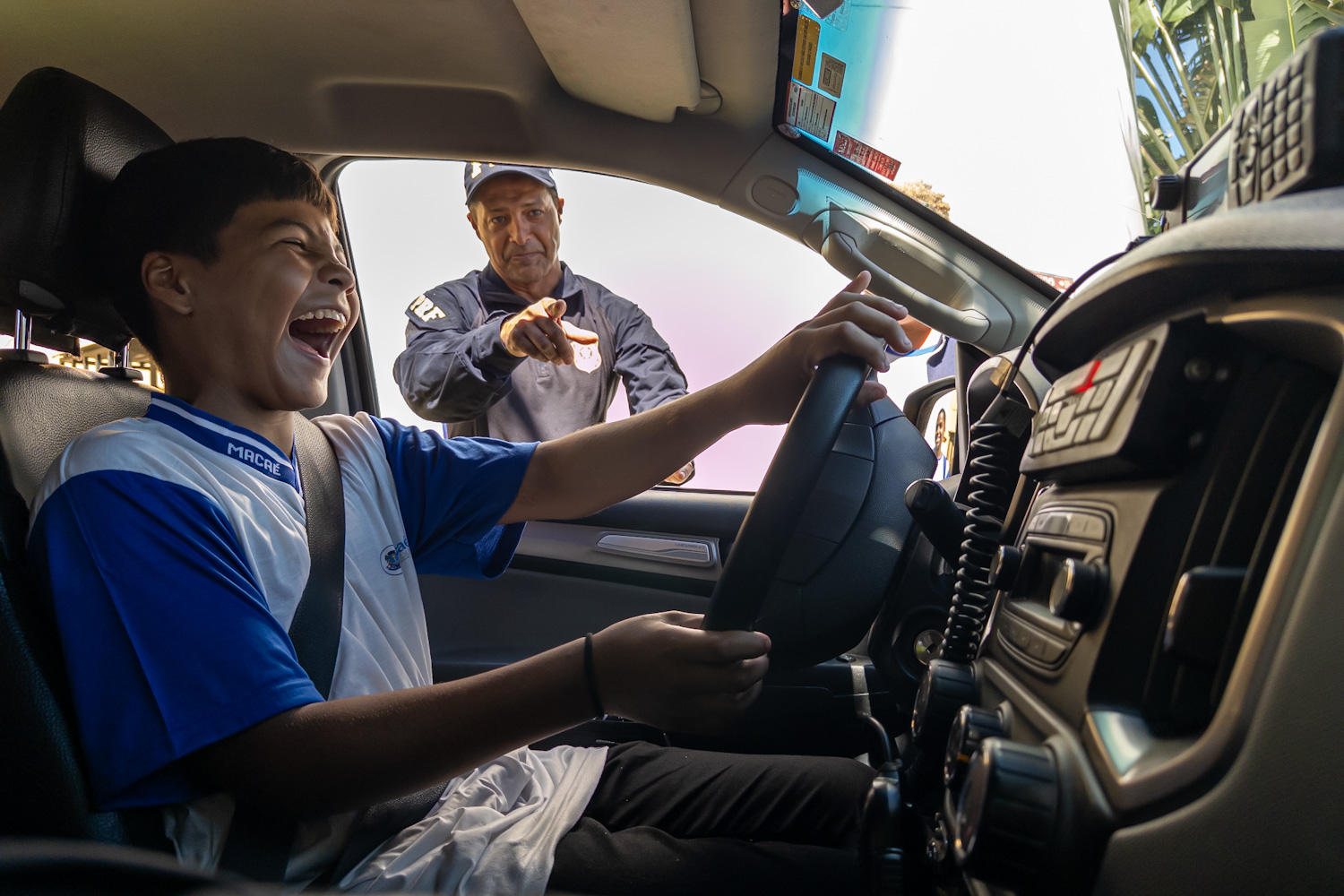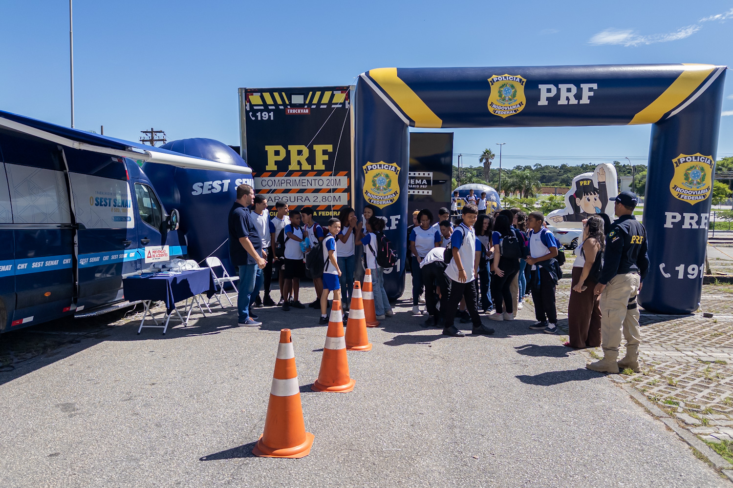 Levi Ferreira (12), que usou os óculos de simulação de efeitos etílicos e de sonolência, tentou passar por obstáculos. “Não é fácil. As imagens aparecem esticadas. Nunca vou usar álcool para dirigir”, afirmou. Joana Angélica Gonçalves (12) conheceu uma viatura da PRF por dentro. “Achei muito legal, principalmente o rádio para comunicação”.