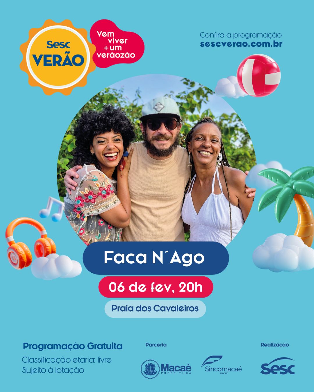 O Fest Verão recebe nesta sexta-feira (6), às 20 horas, o grupo Faca N’Agô, que sobe ao palco montado na Praia dos Cavaleiros com um show marcado pela energia do samba de raiz e pela força da música autoral. À frente do projeto estão Cláudia Falcão, Thati Dias e Jefferson Ferreira, artistas com trajetórias reconhecidas na cena cultural da região.