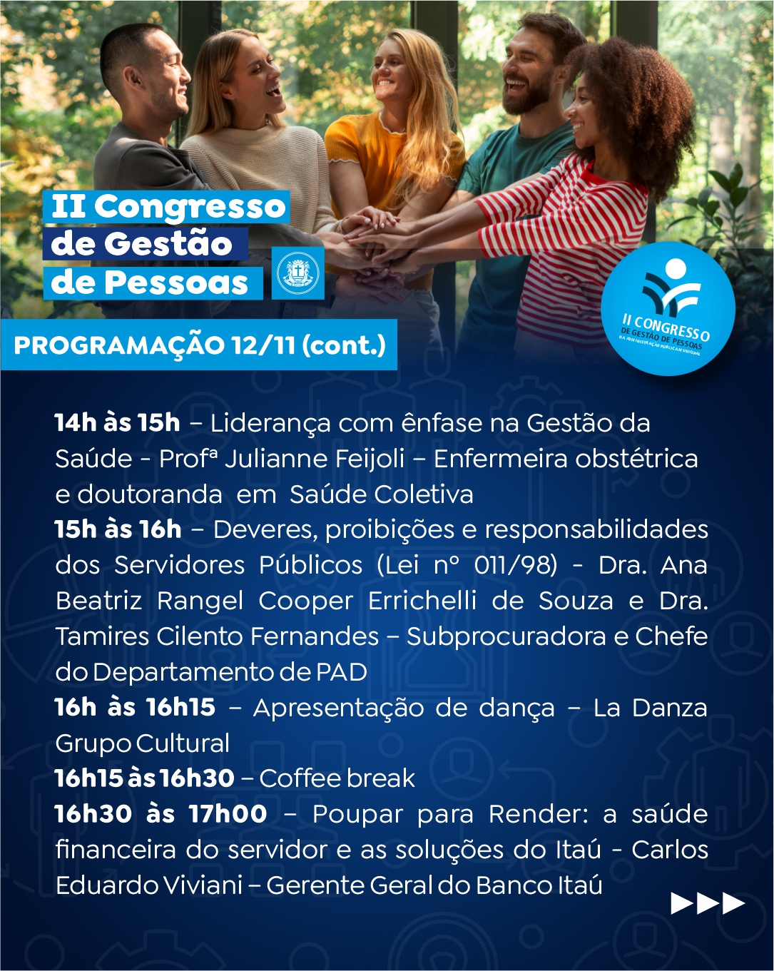 A programação contempla temas essenciais ao fortalecimento das práticas de gestão no setor público, com destaque para lideranças saudáveis, proatividade, comunicação assertiva e relações interpessoais.