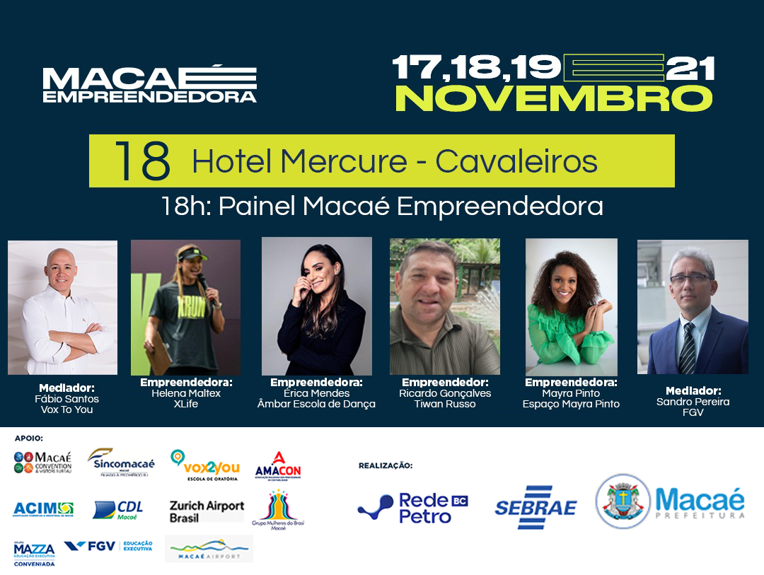 No dia 18 de novembro, a programação da Semana Macaé Empreendedora acontece no Hotel Mercure, com uma série de atividades voltadas à geração de negócios e ao fortalecimento do setor produtivo local. Após a Rodada de Negócios, das 8h30 às 12h, e o Seminário de Descomissionamento, das 14h às 17h, o público confere, às 18h, mais uma edição do Painel Macaé Empreendedora, com a participação de Érica Mendes, da Âmbar Escola de Dança; Russo, do Restaurante do Russo; e Helena Maltez, da XLife. O encontro antecede a Palestra Master com Caito Maia, fundador da Chilli Beans, que encerra as atividades do dia às 20h.