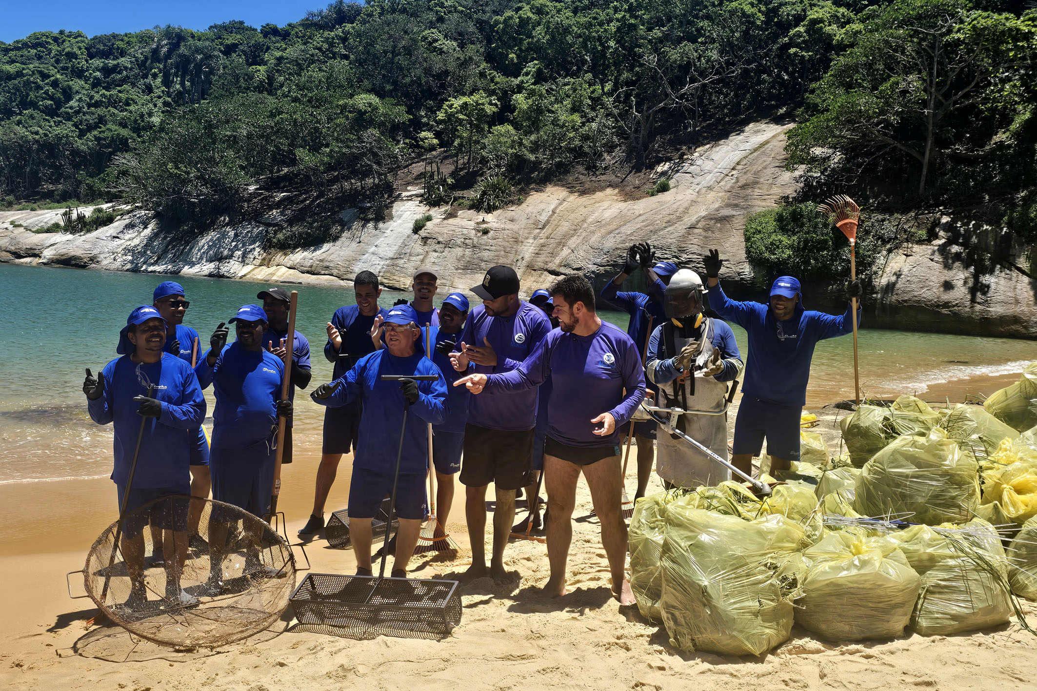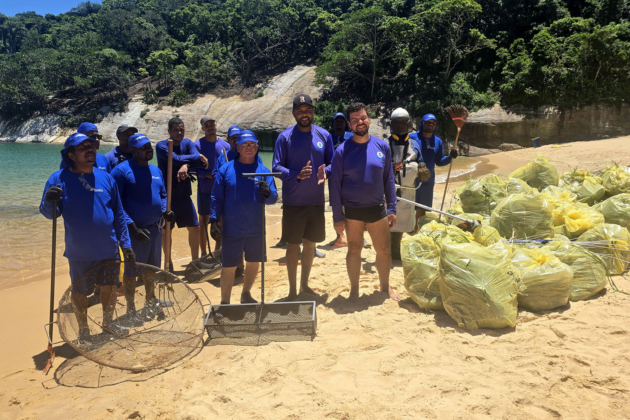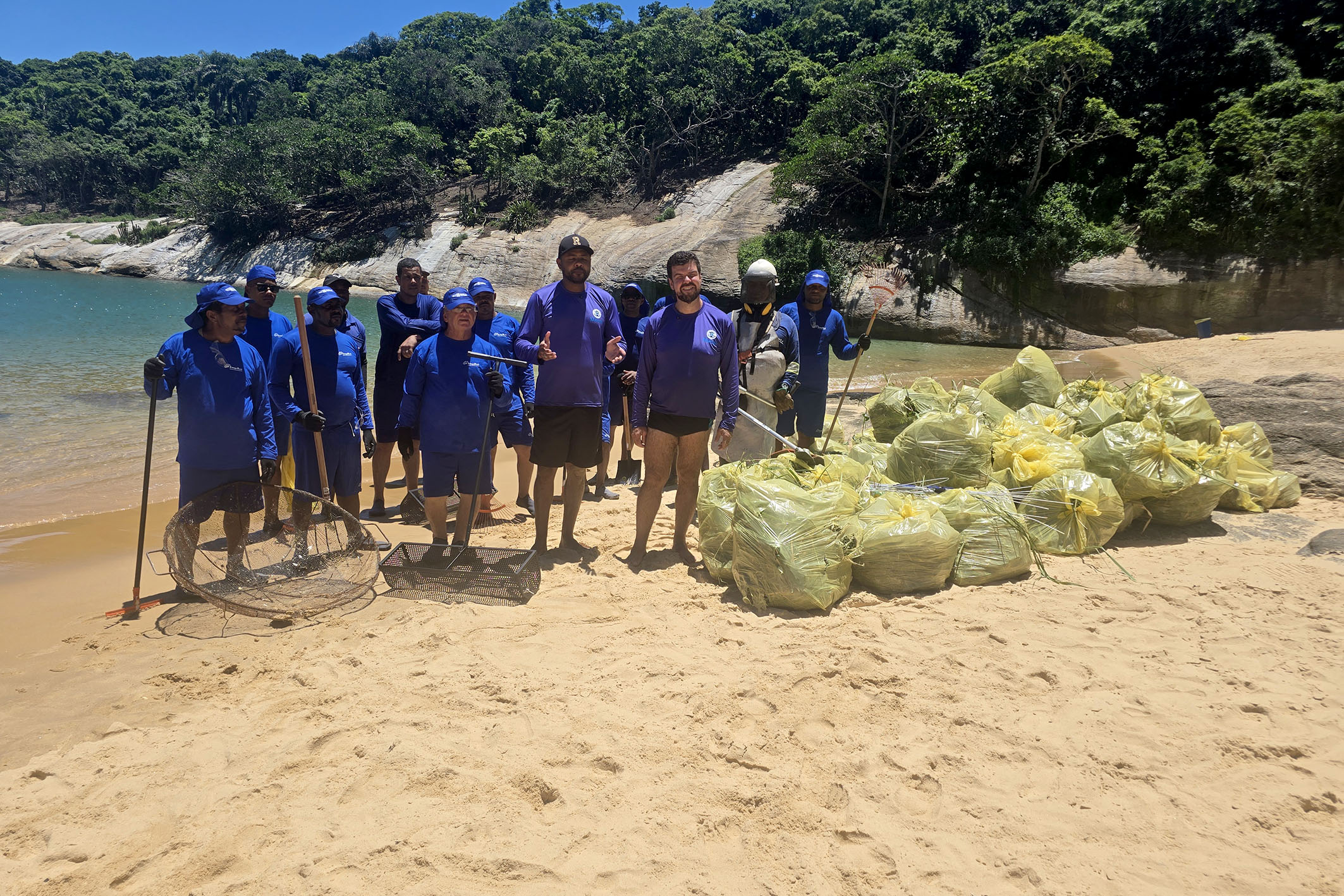 Os trabalhadores atuaram devidamente equipados com bonés apropriados, camisas com proteção UV, sapatilhas para evitar queimaduras nos pés e protetor solar. Além disso, utilizaram diversos materiais para a limpeza, com destaque para as peneiras circulares e as peneiras de puxar areia, que fizeram toda a diferença na retirada dos microlixos - como bitucas de cigarro, tampinhas de garrafa, fragmentos de vidro e pequenos plásticos. Ao final, foram retirados em média duzentos sacos de lixo de grande capacidade, mostrando a dimensão do esforço coletivo.