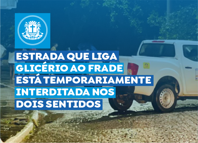 A Secretaria de Mobilidade Urbana informa que a estrada que liga Glicério ao Frade, na região serrana, está temporariamente interditada nos dois sentidos. A medida foi adotada após a queda de um poste na via.