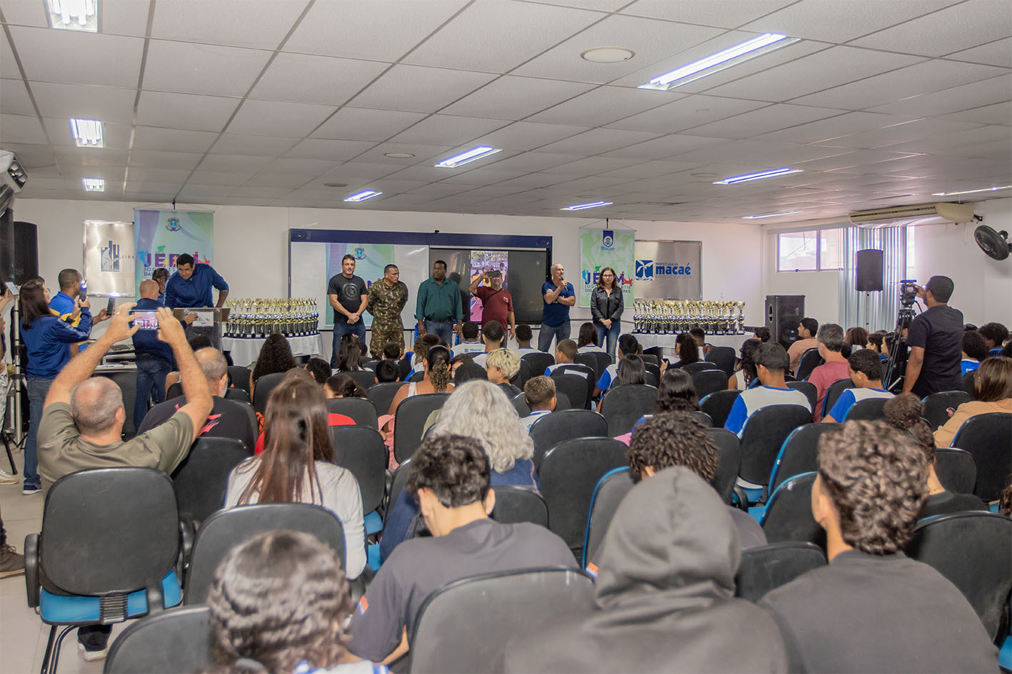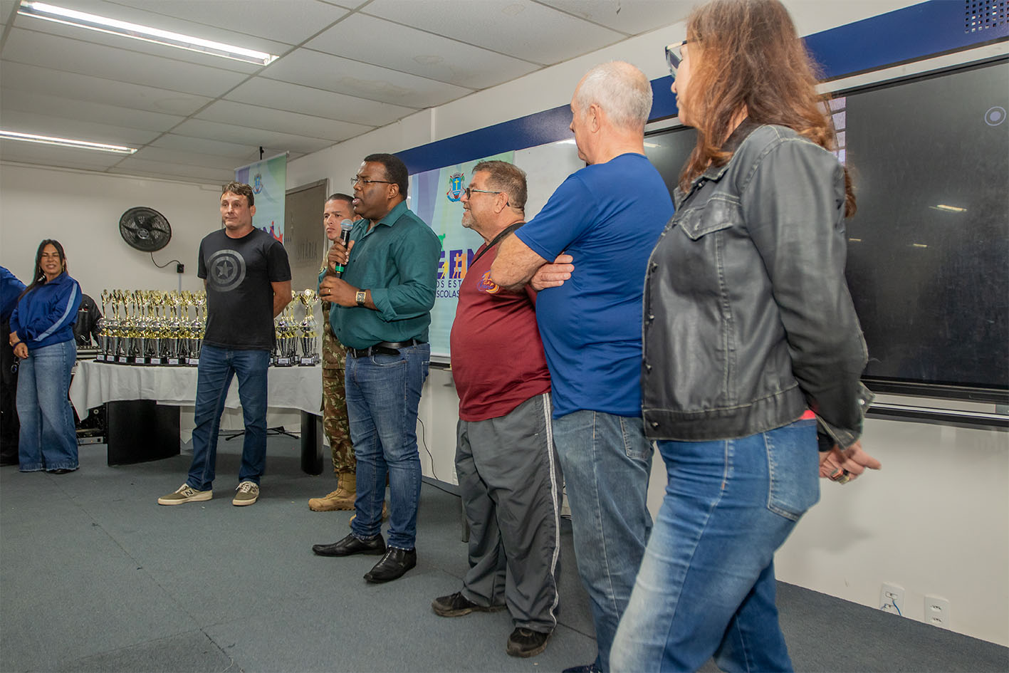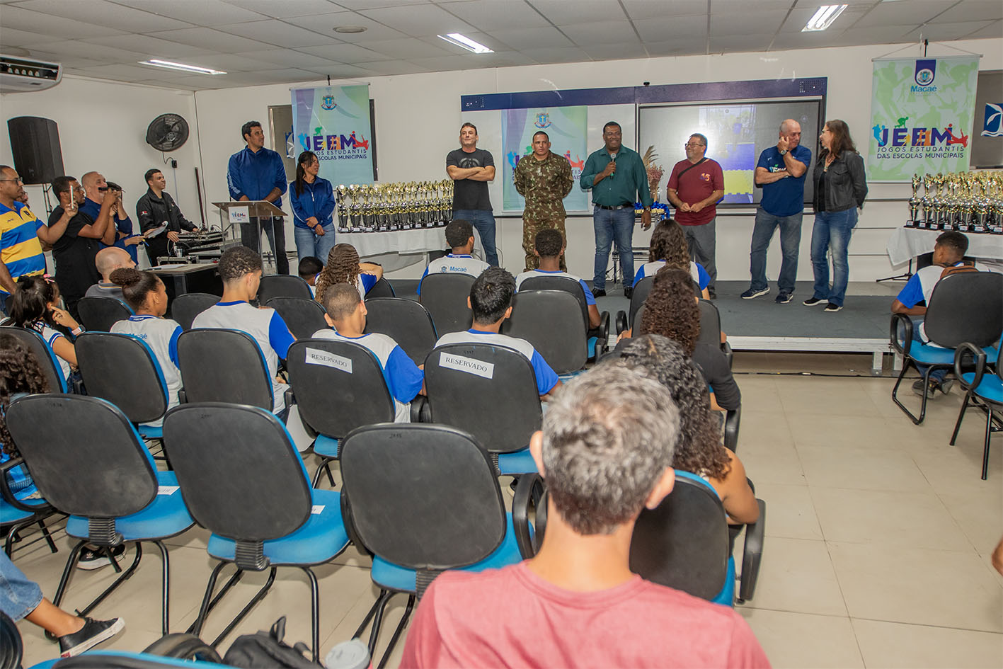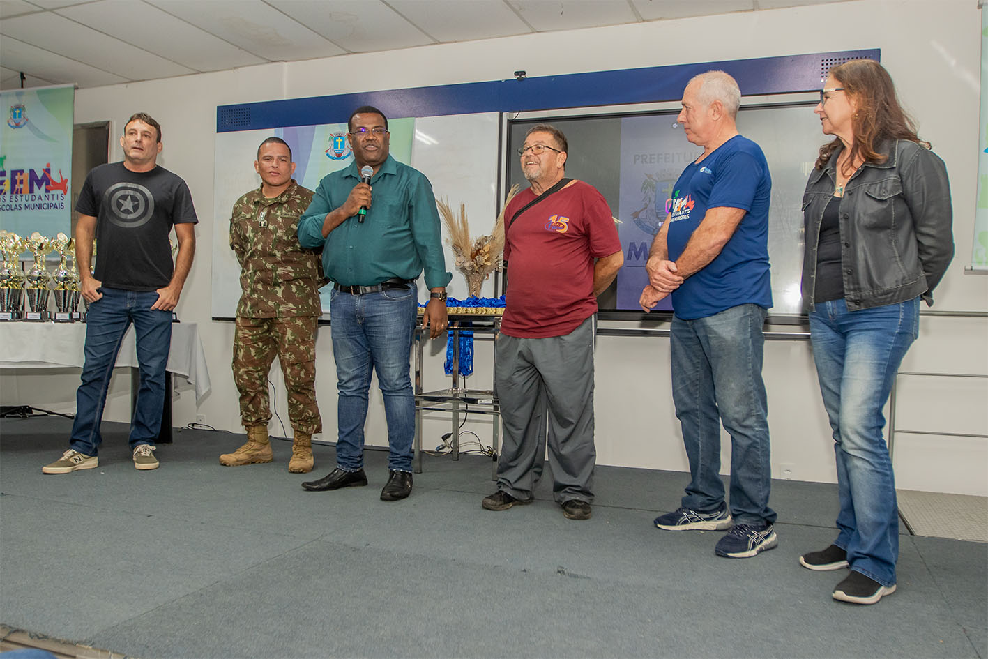 A cerimônia contou ainda com homenagens aos chamados “Amigos do JEEM”, pessoas e instituições que apoiam e fortalecem a iniciativa ao longo dos anos. Foram homenageados o vice-prefeito Fabiano Paschoal; o vereador Marvel Maillet; o secretário de Esportes César Maillet; a superintendente pedagógica. Balade Ayala; o capitão Arraes, representando o Forte Marechal Hermes, e o professor Jorge Aquiles, em nome dos professores da rede municipal.