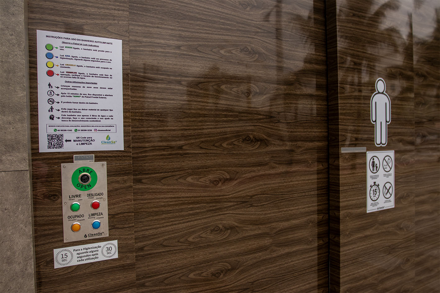 Os módulos têm projeto antivandalismo, estrutura em aço galvanizado com acabamento em aço inox e revestimento resistente. Medem externamente 190 cm de profundidade, 499 cm de comprimento e 250 cm de altura, com espaço interno confortável para uso e circulação. Funcionam com automação controlada por CLP, portas automáticas com sistema antiesmagamento, descarga por sucção com consumo de até 2 litros, limpeza e secagem automáticas da bacia e do piso, acionamento por sensores (sem toque) e sistemas de iluminação, ventilação e aromatização automáticos. Há também interface de voz para orientar o usuário e sinalização externa do status de funcionamento.
