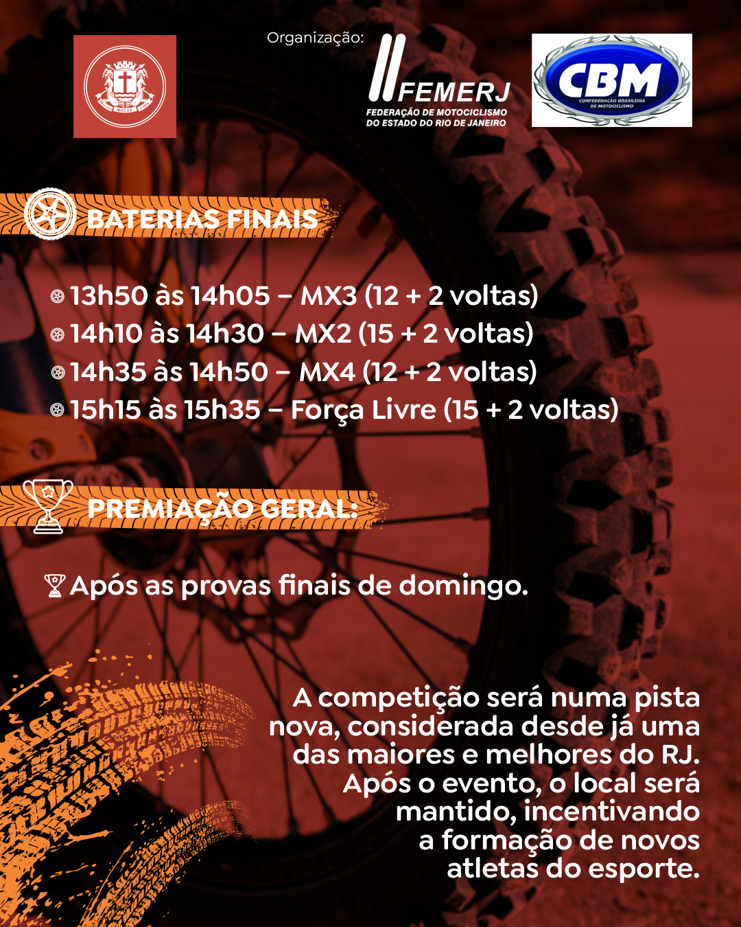 - 12h20 às 13h45 – Corridas das categorias MX3 (35/40), MX4 (40/45), 250cc, 450cc, Nacional e Pró