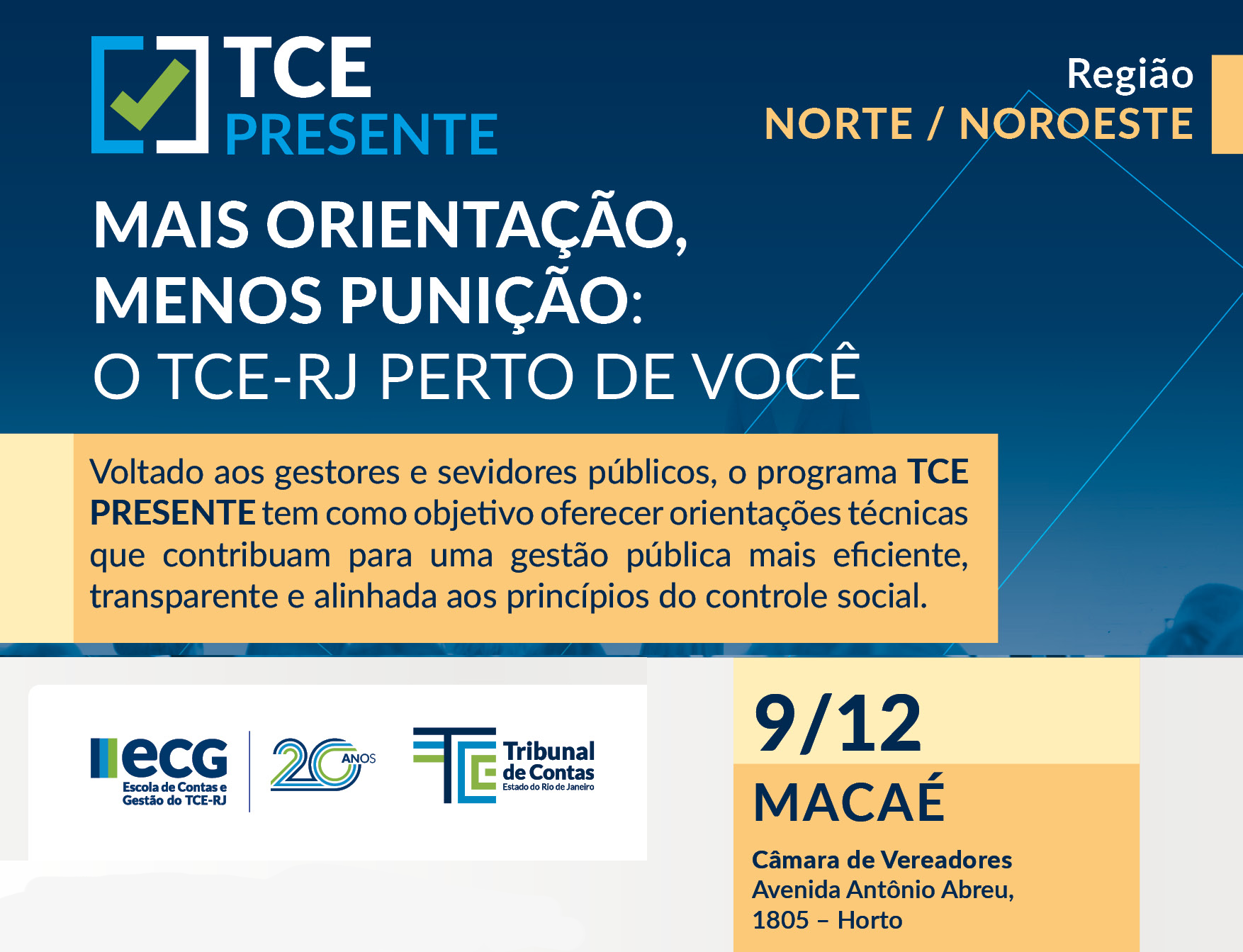 Com o objetivo de aproximar o Tribunal de Contas do Estado do Rio de Janeiro (TCE-RJ) dos gestores e servidores municipais, Macaé sediará no dia 9 de dezembro, o programa “TCE Presente – Mais orientação, menos punição: o TCE-RJ perto de você”. O encontro acontece na Câmara Municipal - responsável pela organização do evento - a partir das 9h30, e é voltado a gestores, controladores, técnicos e servidores públicos da Região Norte/Noroeste Fluminense. A inscrição, gratuita, é feita neste link.