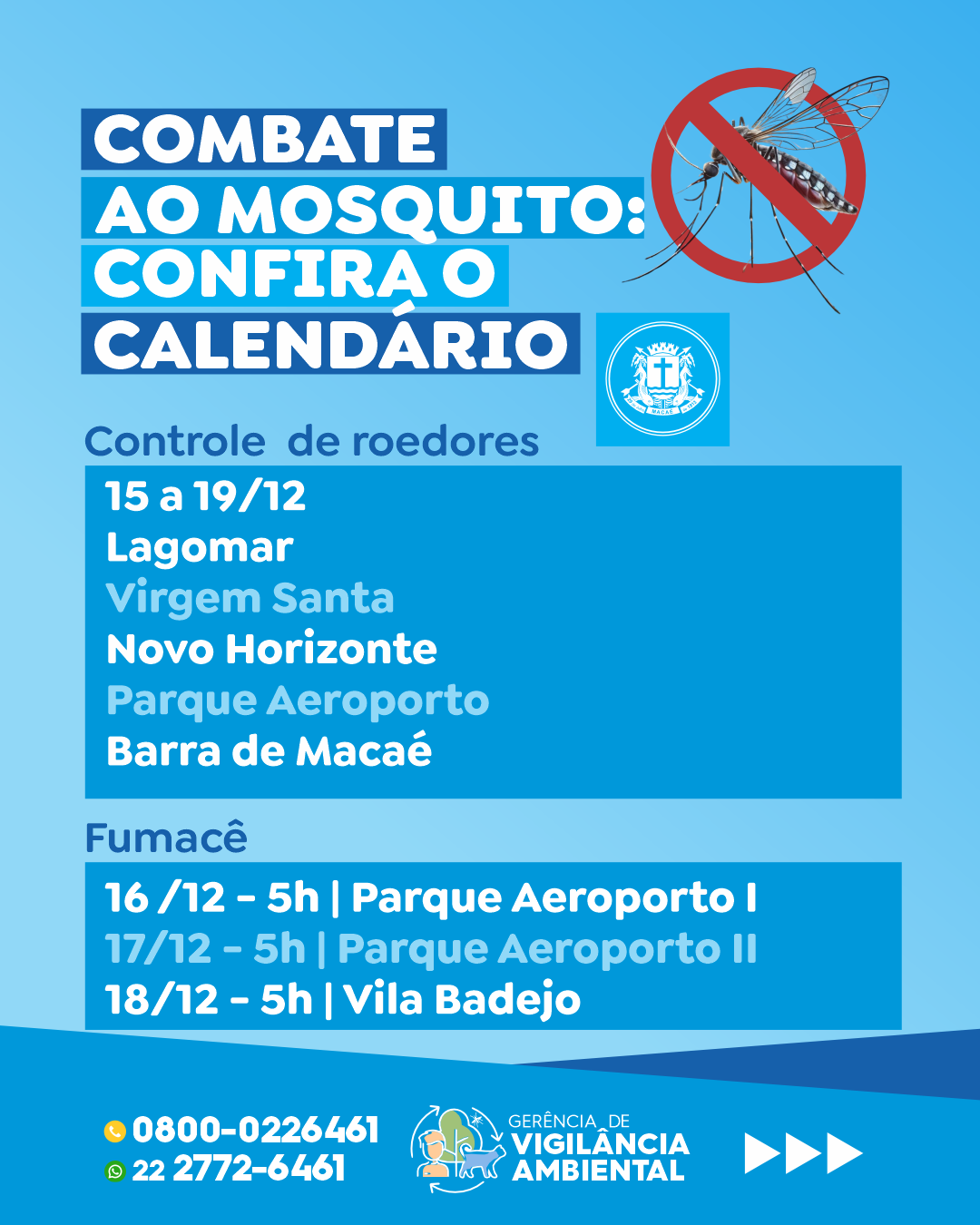 A Prefeitura de Macaé, por meio da Gerência de Vigilância Ambiental da Secretaria de Saúde, continua na próxima semana a série de ações integradas de prevenção, controle de vetores e promoção da saúde em diversas localidades do município.