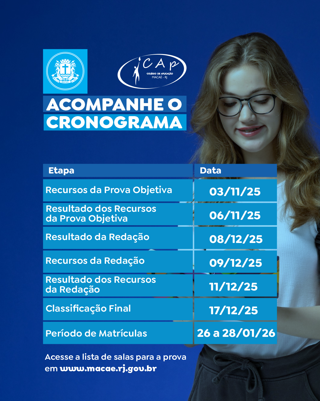 Já está disponível no portal da Prefeitura (macae.rj.gov.br) a lista com as salas da realização da prova do processo seletivo do Colégio de Aplicação (Cap), edital 01/2025. A avaliação, com questões objetivas e redação, será neste domingo (19), das 9h às 13h, na Cidade Universitária. Estão sendo oferecidas 100 vagas gratuitas para a 1ª Série do Ensino Médio, no ano letivo de 2026.