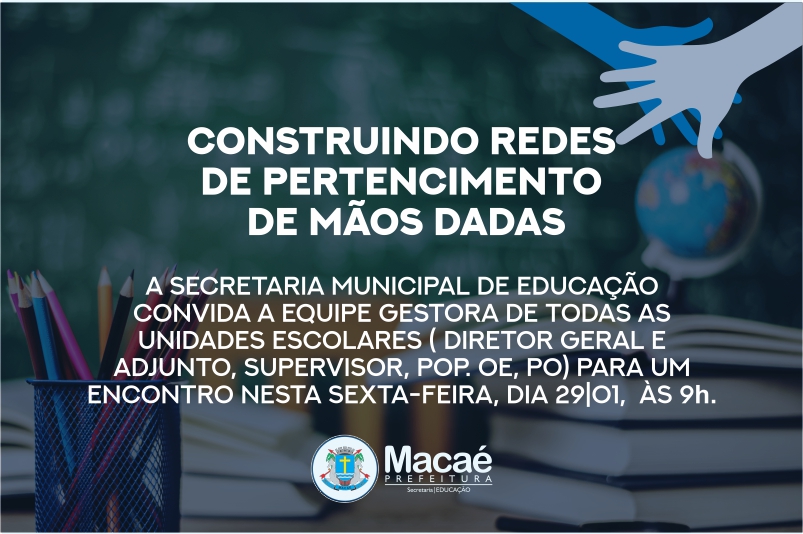 Diretores, orientadores pedagógicos e educacionais, supervisores e professores orientadores participam nesta sexta-feira (29), às 9h, da programação de acolhimento especial realizada pela Secretaria de Educação. O evento vai acontecer no sistema remoto, através de link no canal do Youtube. Com o tema "Construindo Redes de Pertencimento de Mãos Dadas", o encontro tem como objetivo dar boas-vindas às equipes gestoras, fortalecer os princípios das alianças, destacar a coletividade e afetividade, além de apresentar as diretrizes da pasta.