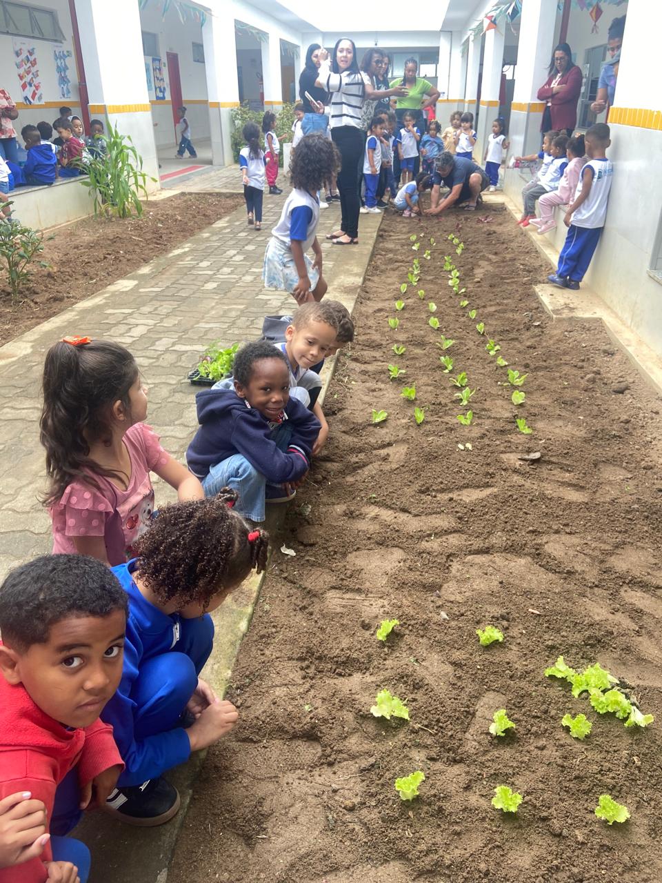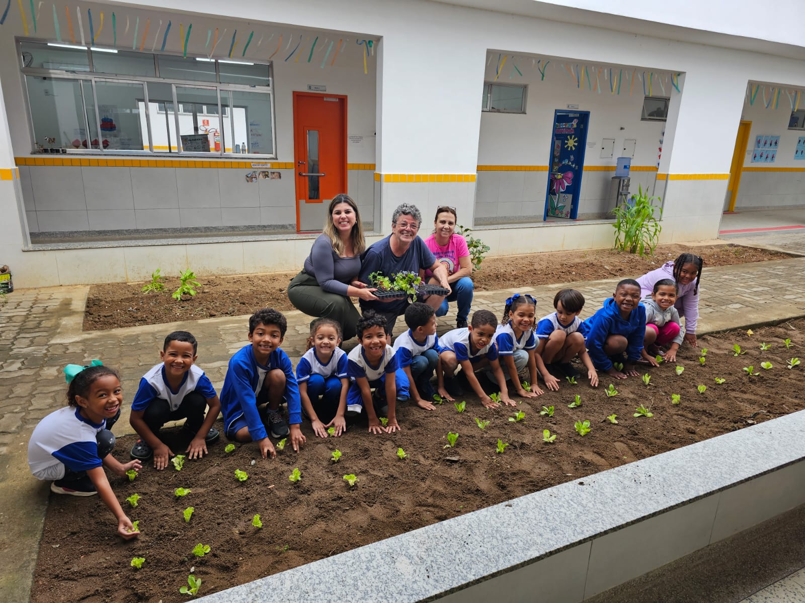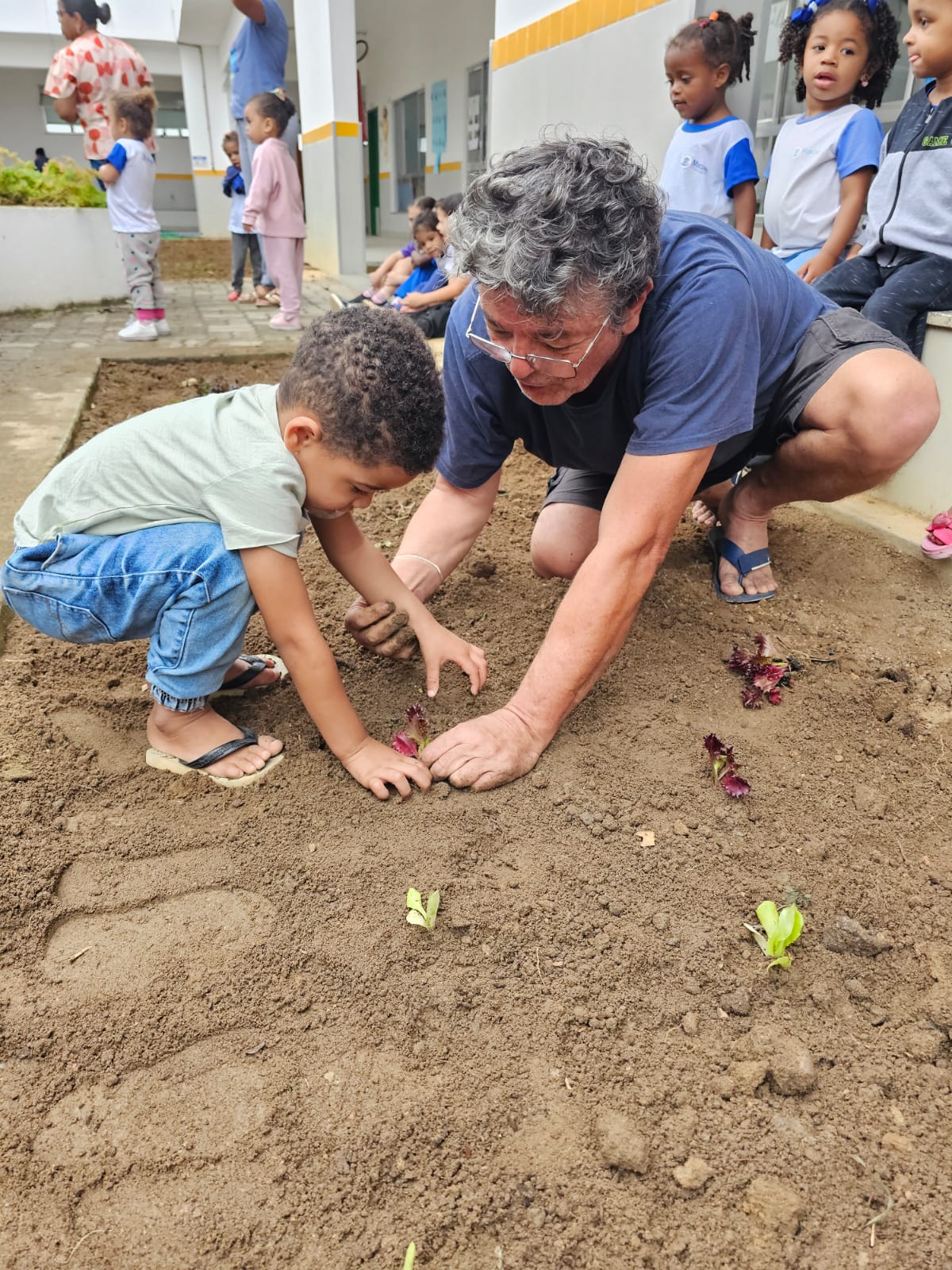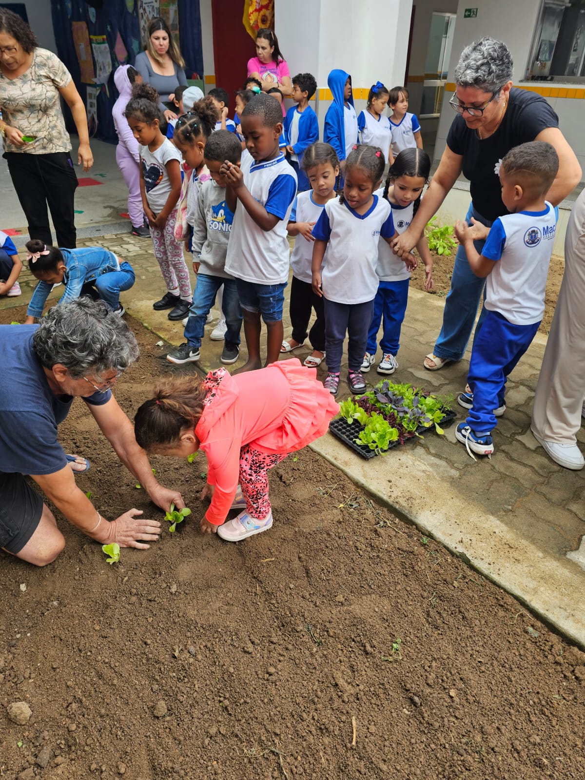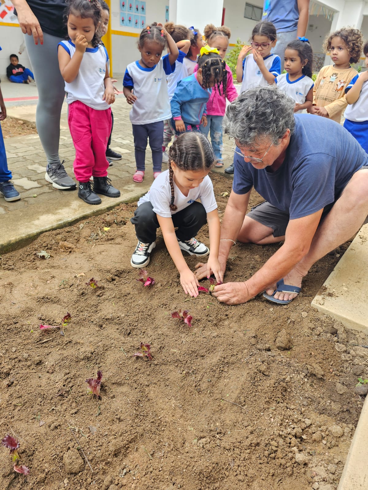 Nesta quarta-feira, uma nova creche recebeu o plantio: a Escola Municipal Zélia de Souza Aguiar, totalizando, atualmente, 10 canteiros comunitários no projeto.