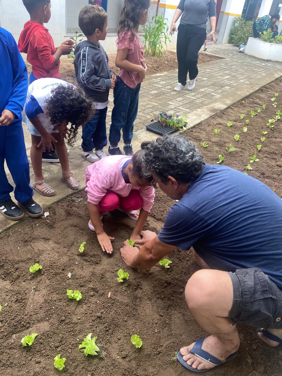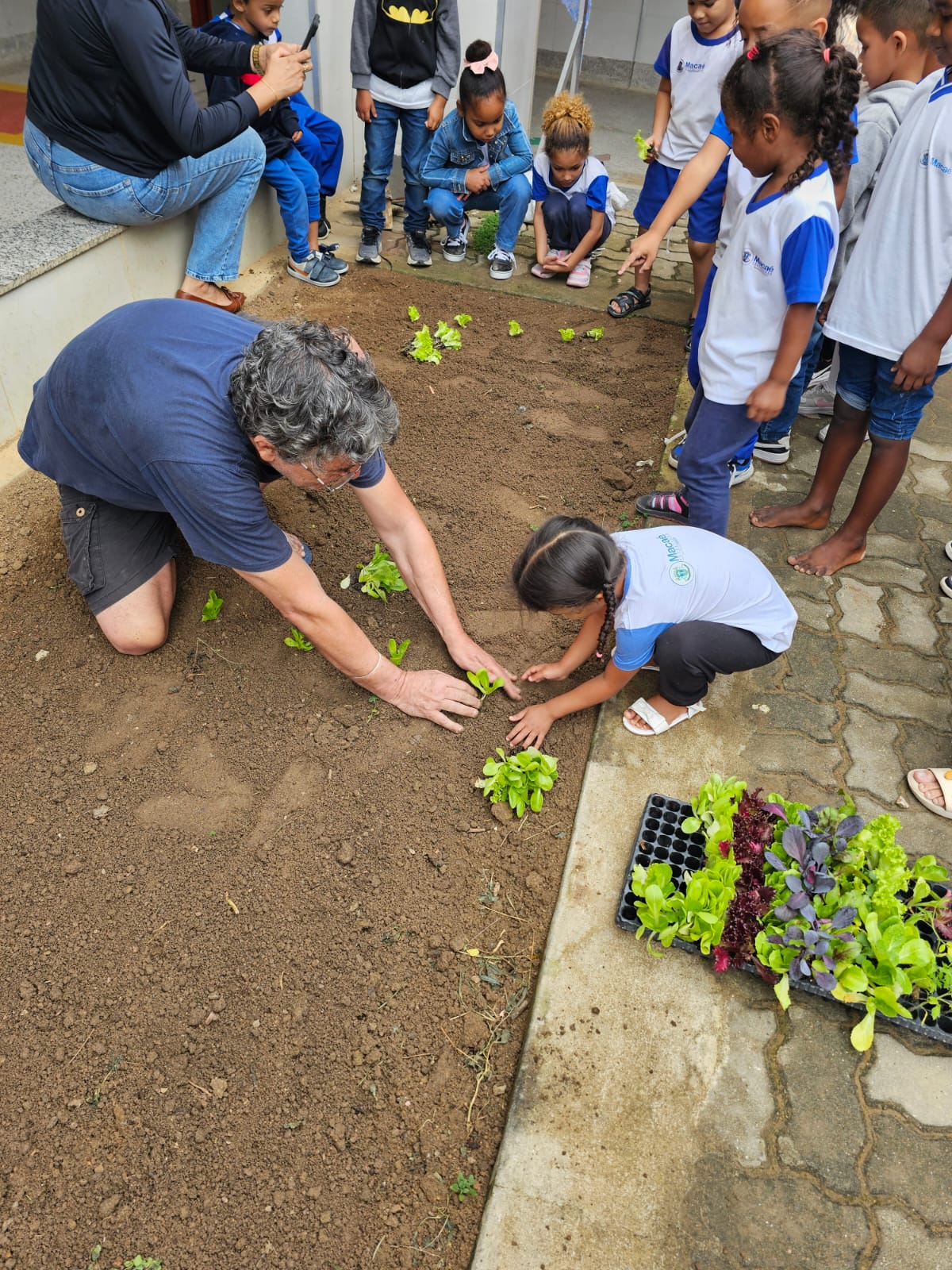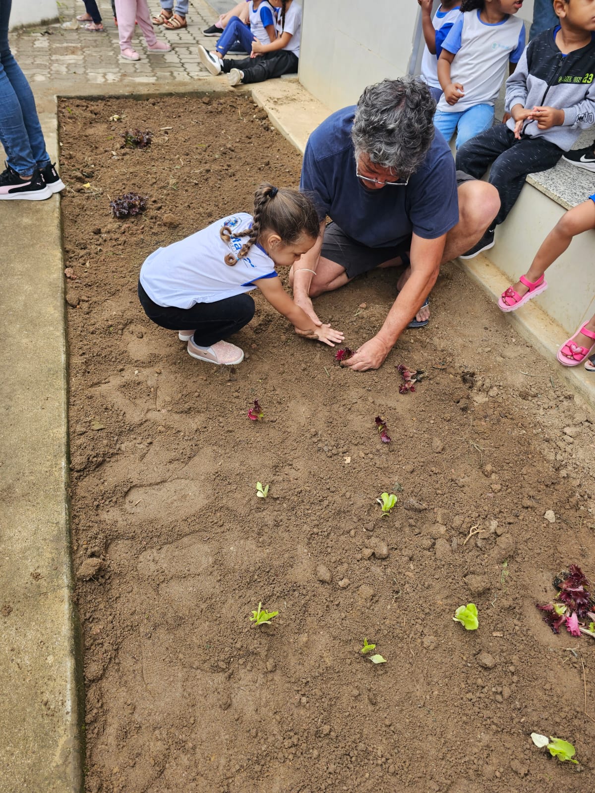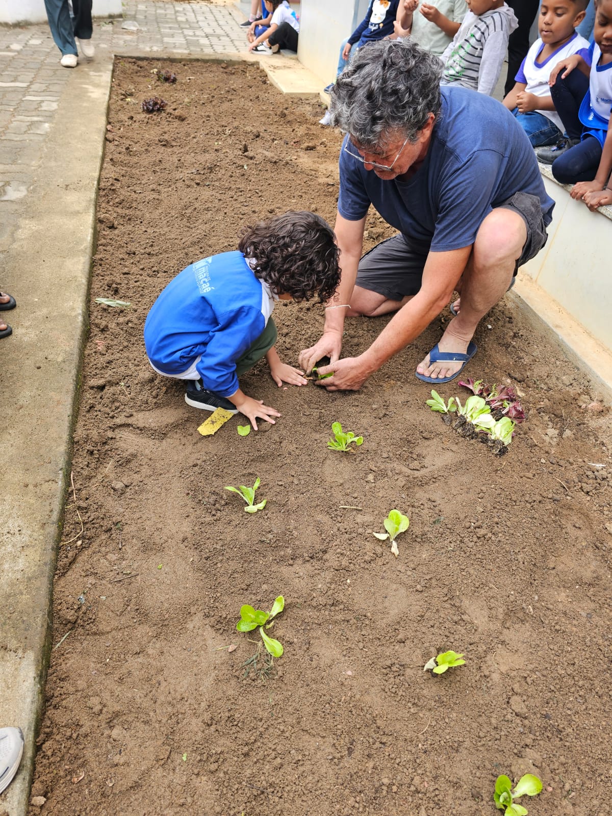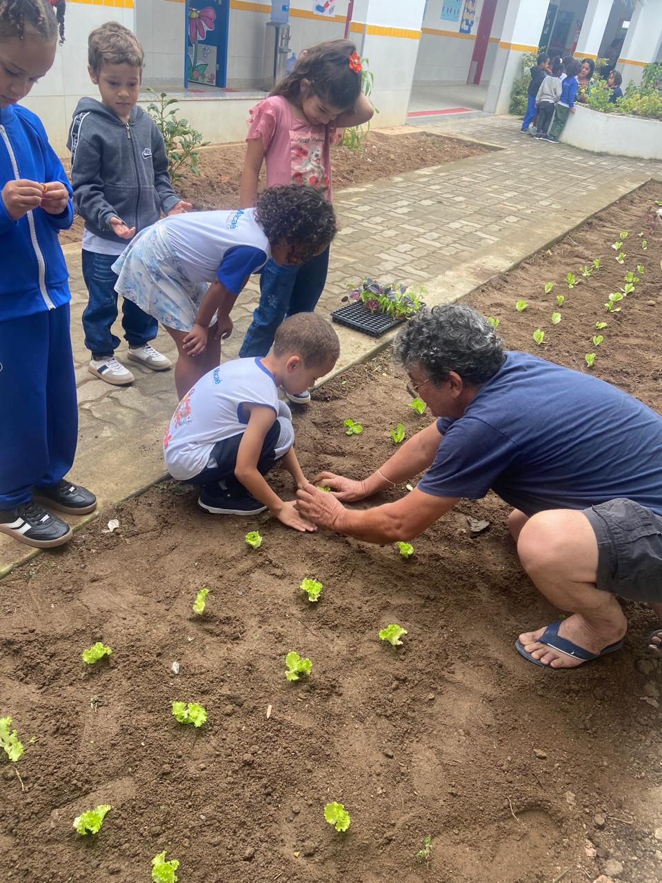 Nesta quarta-feira, uma nova creche recebeu o plantio: a Escola Municipal Zélia de Souza Aguiar, totalizando, atualmente, 10 canteiros comunitários no projeto.