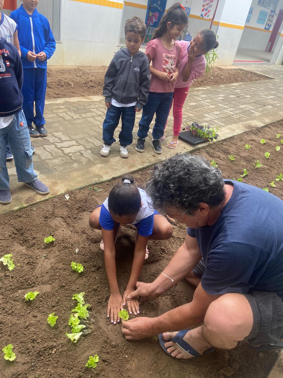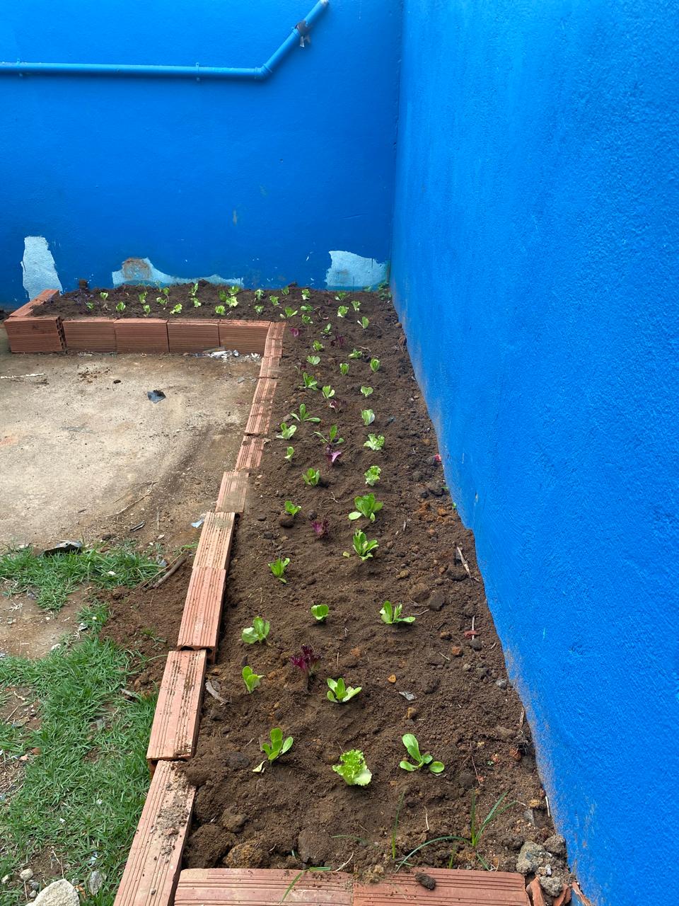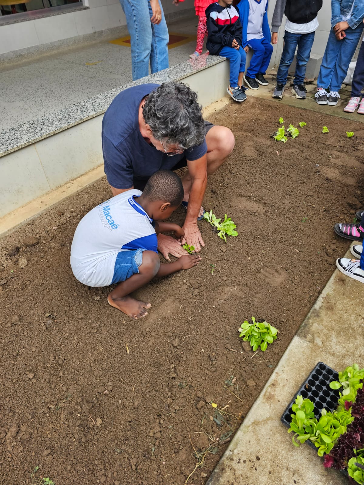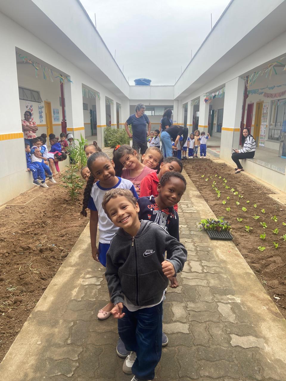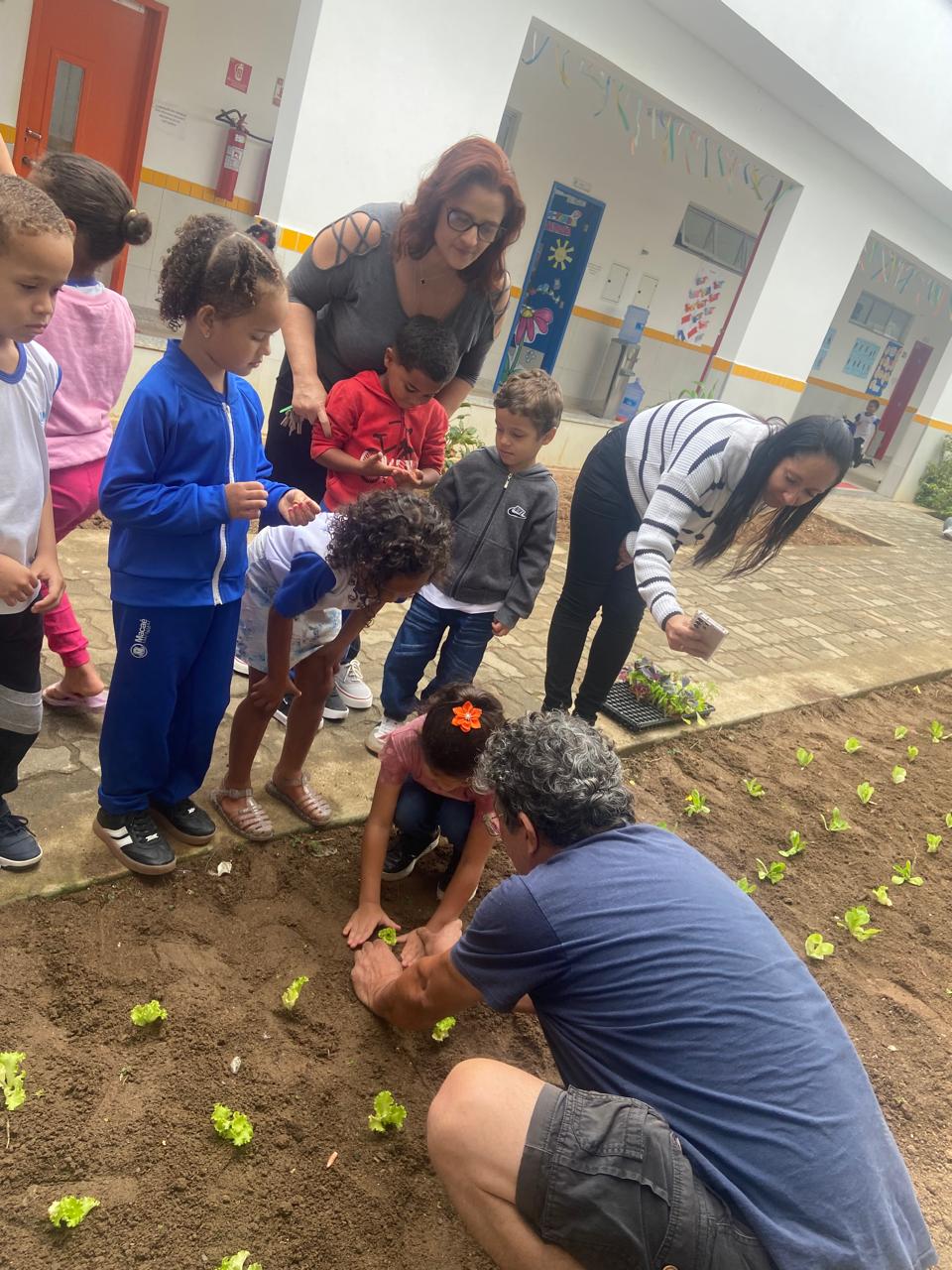 Nesta quarta-feira, uma nova creche recebeu o plantio: a Escola Municipal Zélia de Souza Aguiar, totalizando, atualmente, 10 canteiros comunitários no projeto.