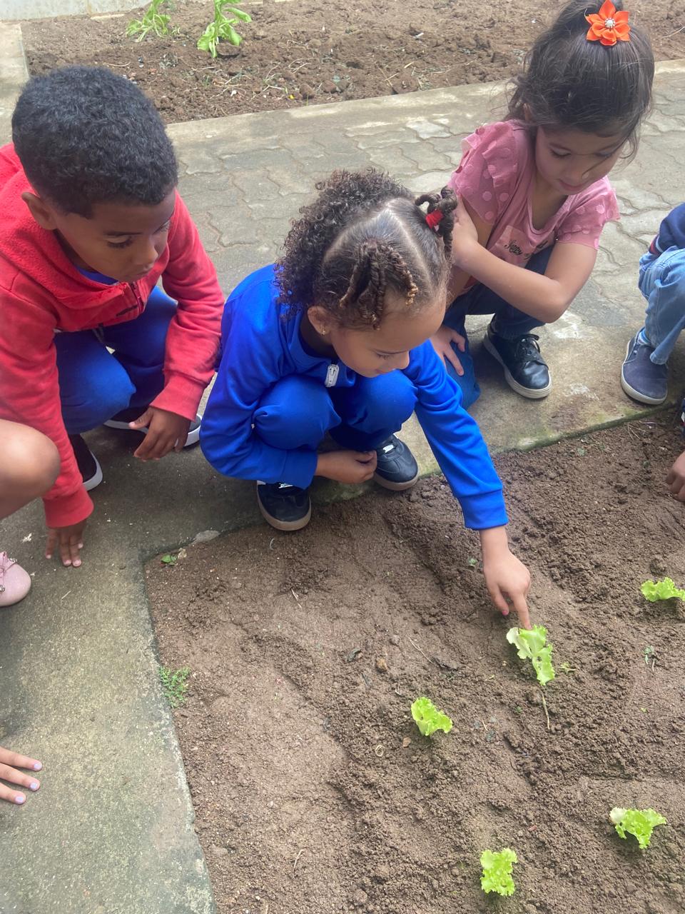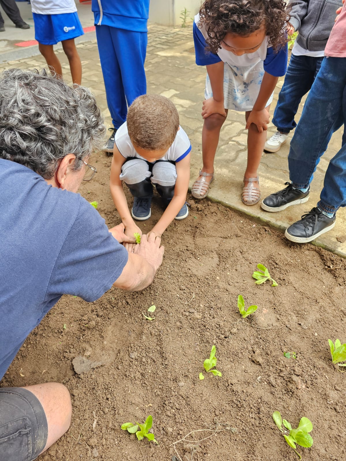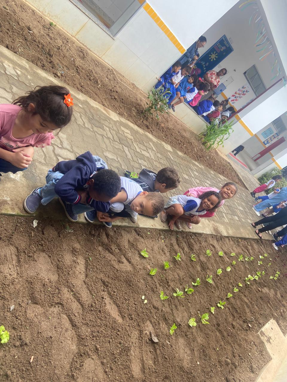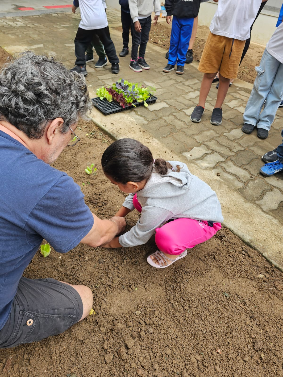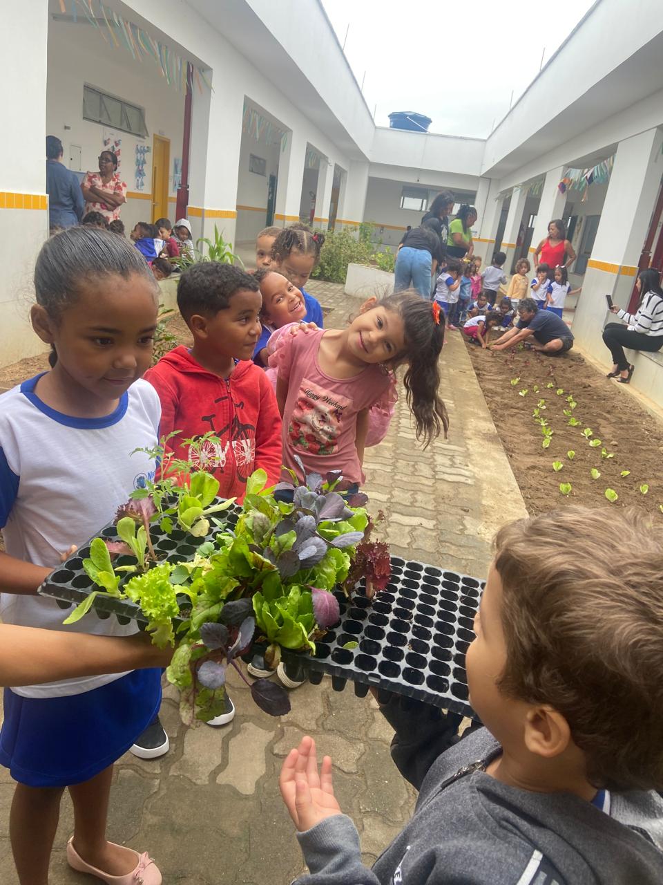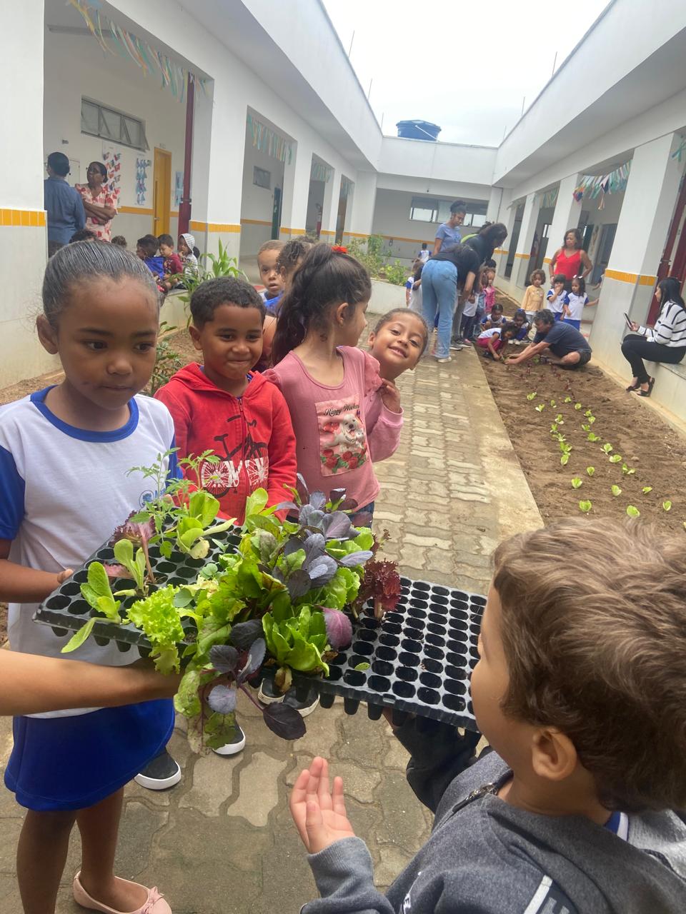 Nesta quarta-feira, uma nova creche recebeu o plantio: a Escola Municipal Zélia de Souza Aguiar, totalizando, atualmente, 10 canteiros comunitários no projeto.