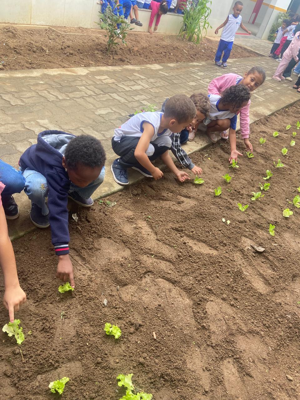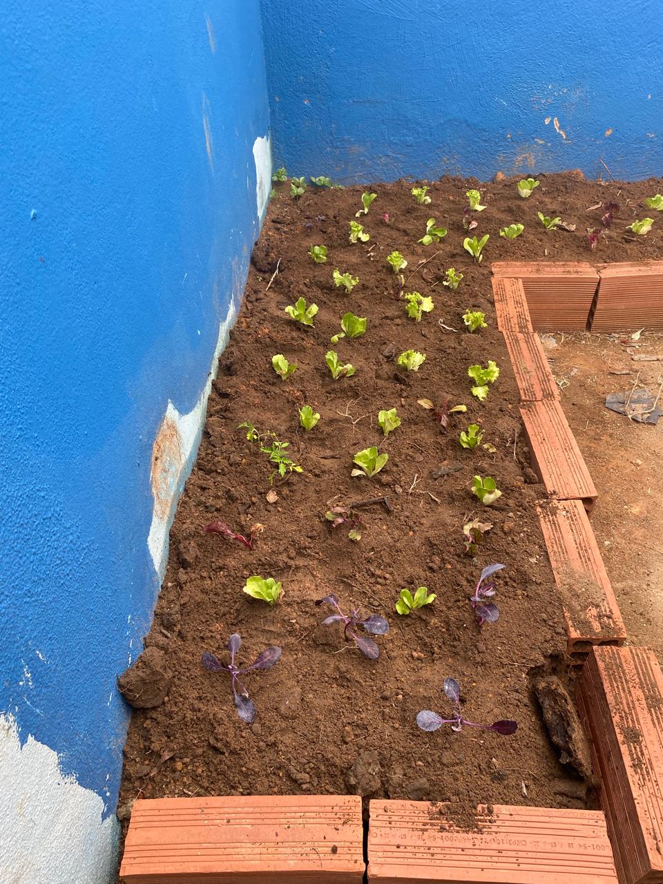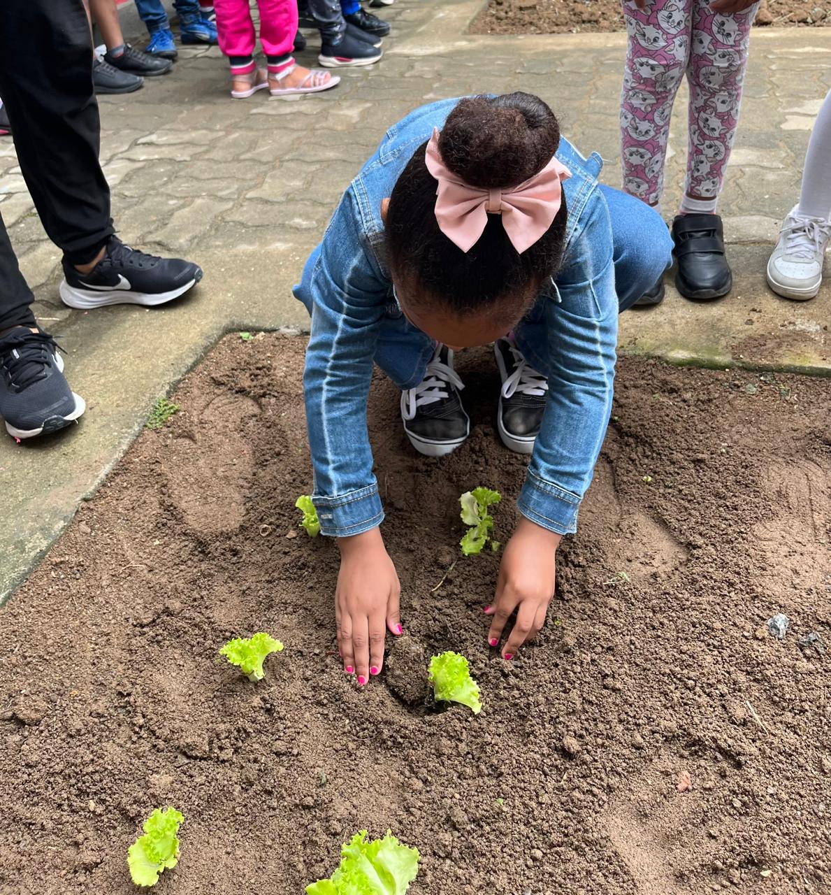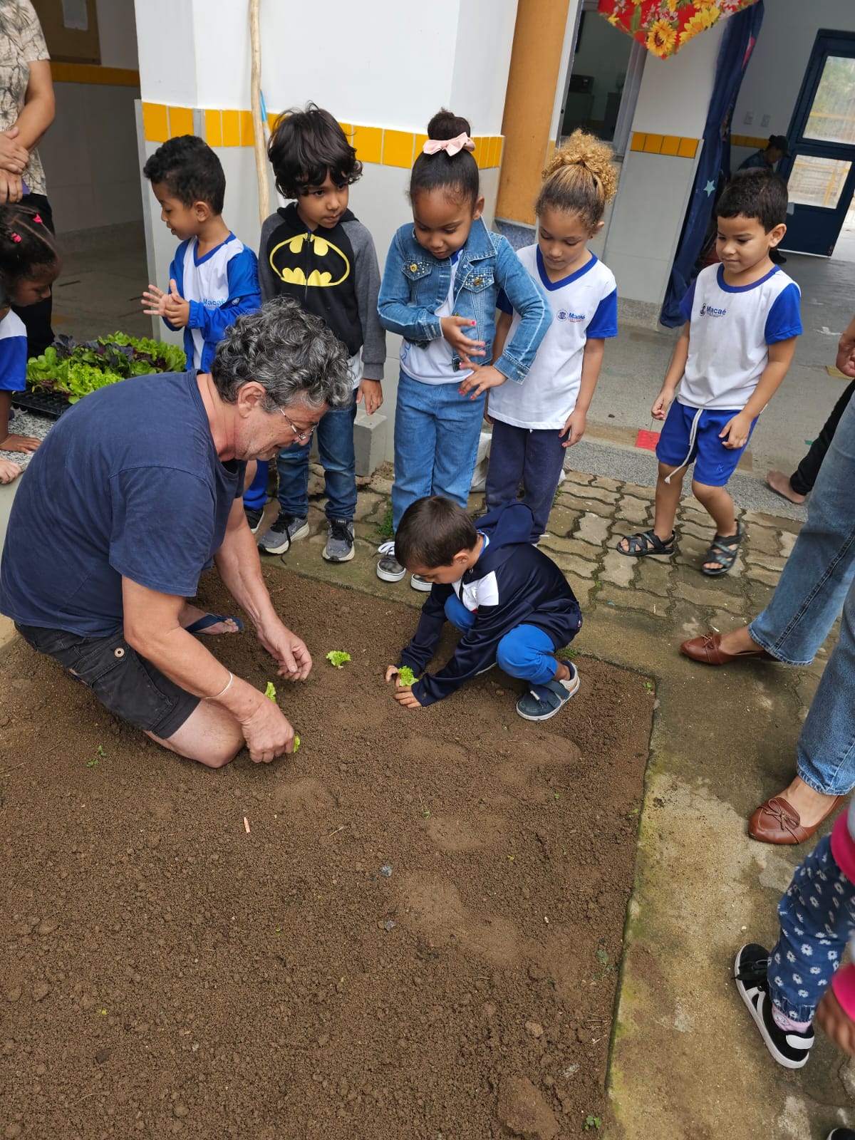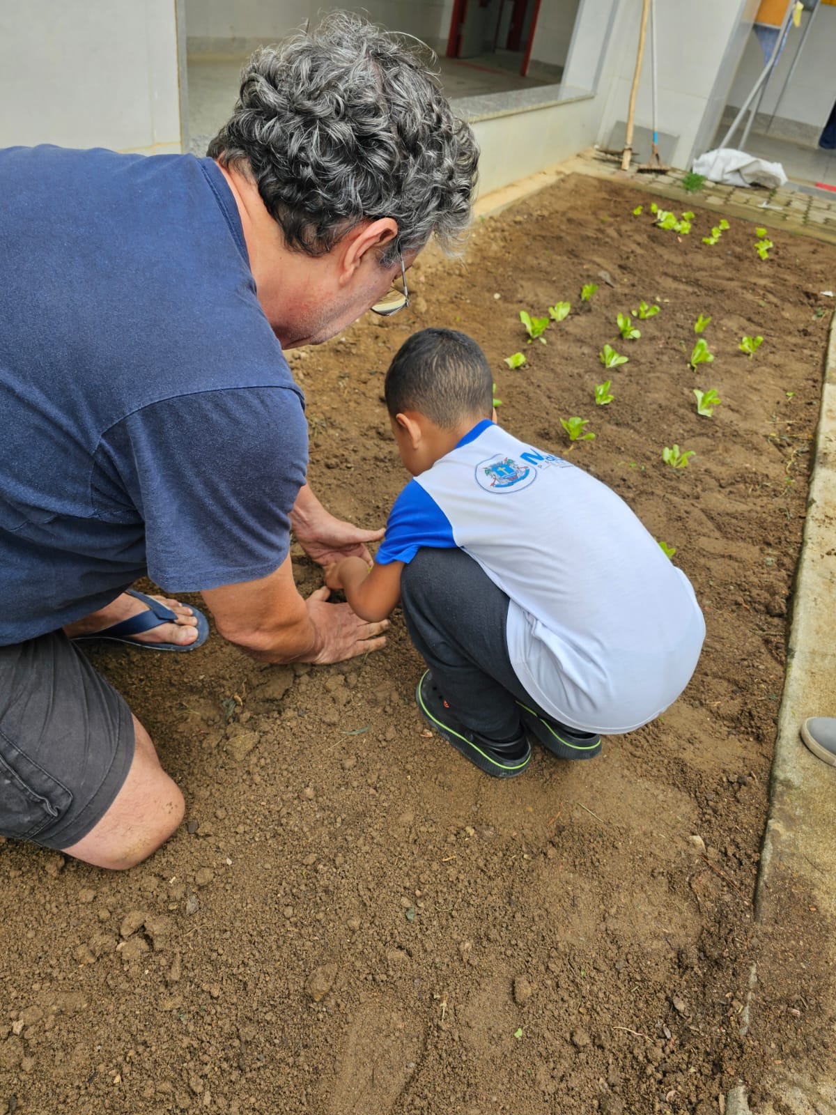 Nesta quarta-feira, uma nova creche recebeu o plantio: a Escola Municipal Zélia de Souza Aguiar, totalizando, atualmente, 10 canteiros comunitários no projeto.