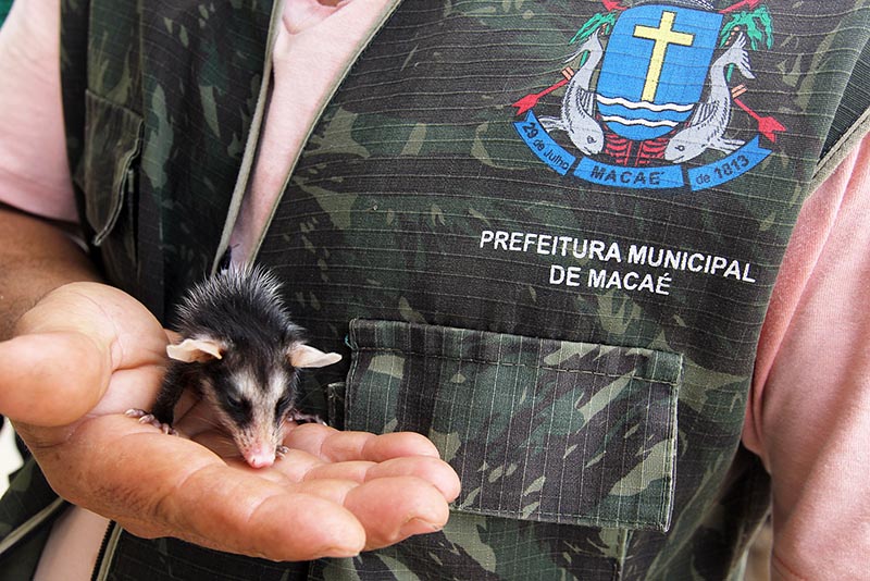 Ela é tão pequenininha que cabe na palma da mão... Ou na cabeça, bem quentinha, embaixo do boné. Sendo cuidada à base de leite - e já caçando besouros pequenos - Joaquina é um filhote de gambá com menos de um mês de idade, mas que já sabe que ficar coladinha com o "papai adotivo" é muito bom. A gambazinha é um dos animais recolhidos e que são cuidados pela equipe de Fauna Silvestre da Secretaria de Ambiente, para então, serem devolvidos à natureza.
