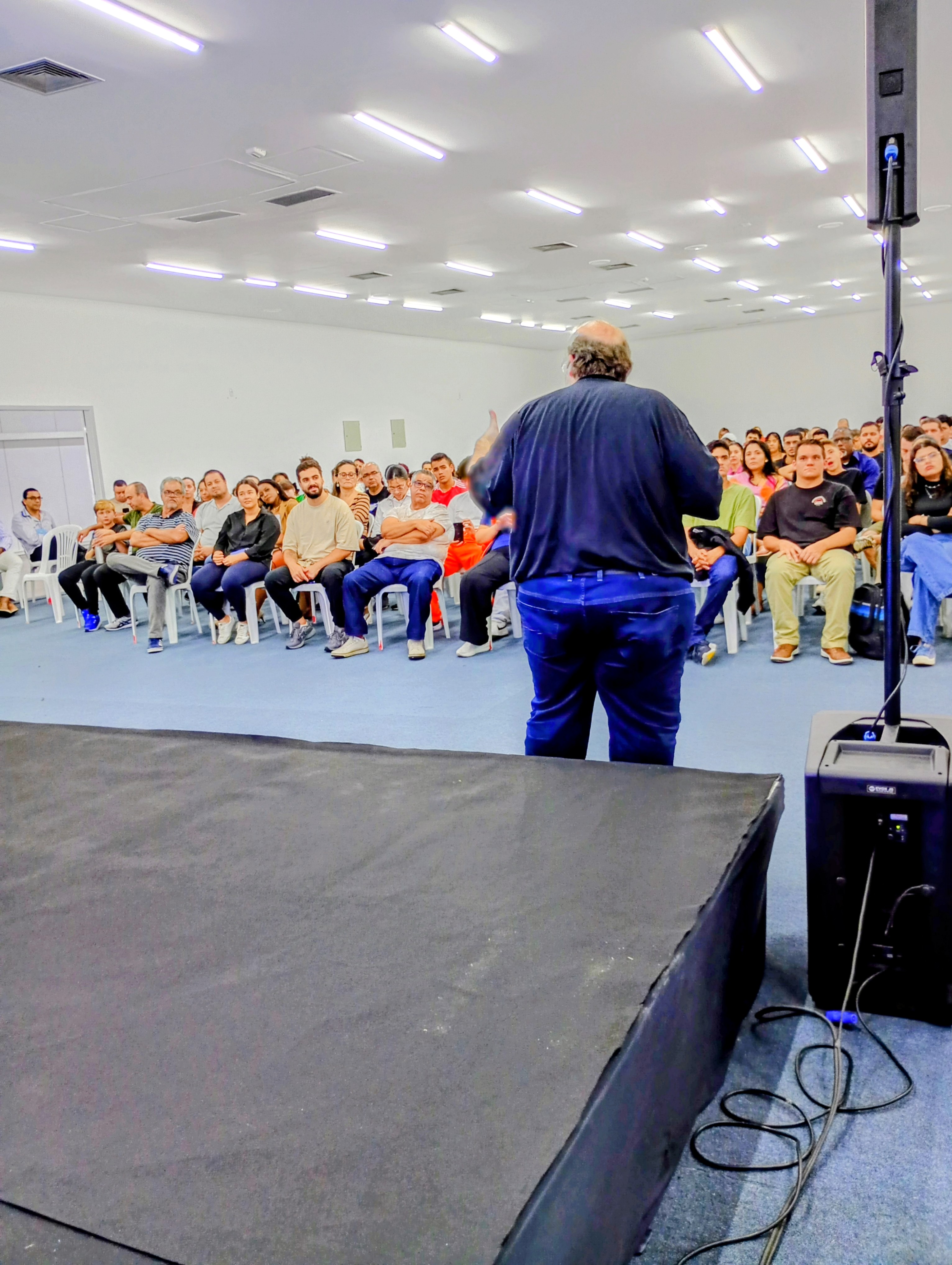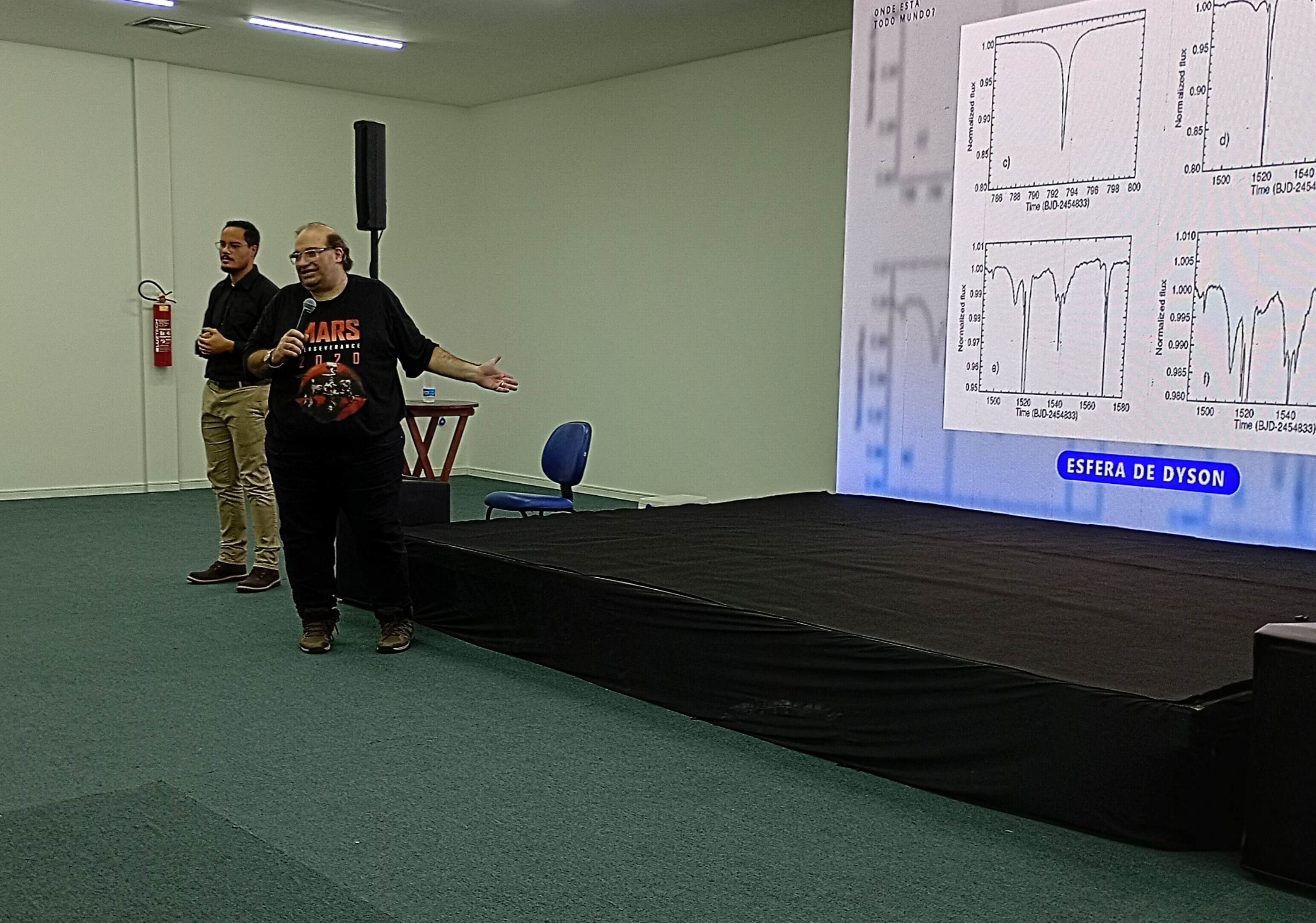 O palestrante falou sobre a teoria do grande filtro, do salto evolutivo da humanidade, de energia, escala de Kardashev.
