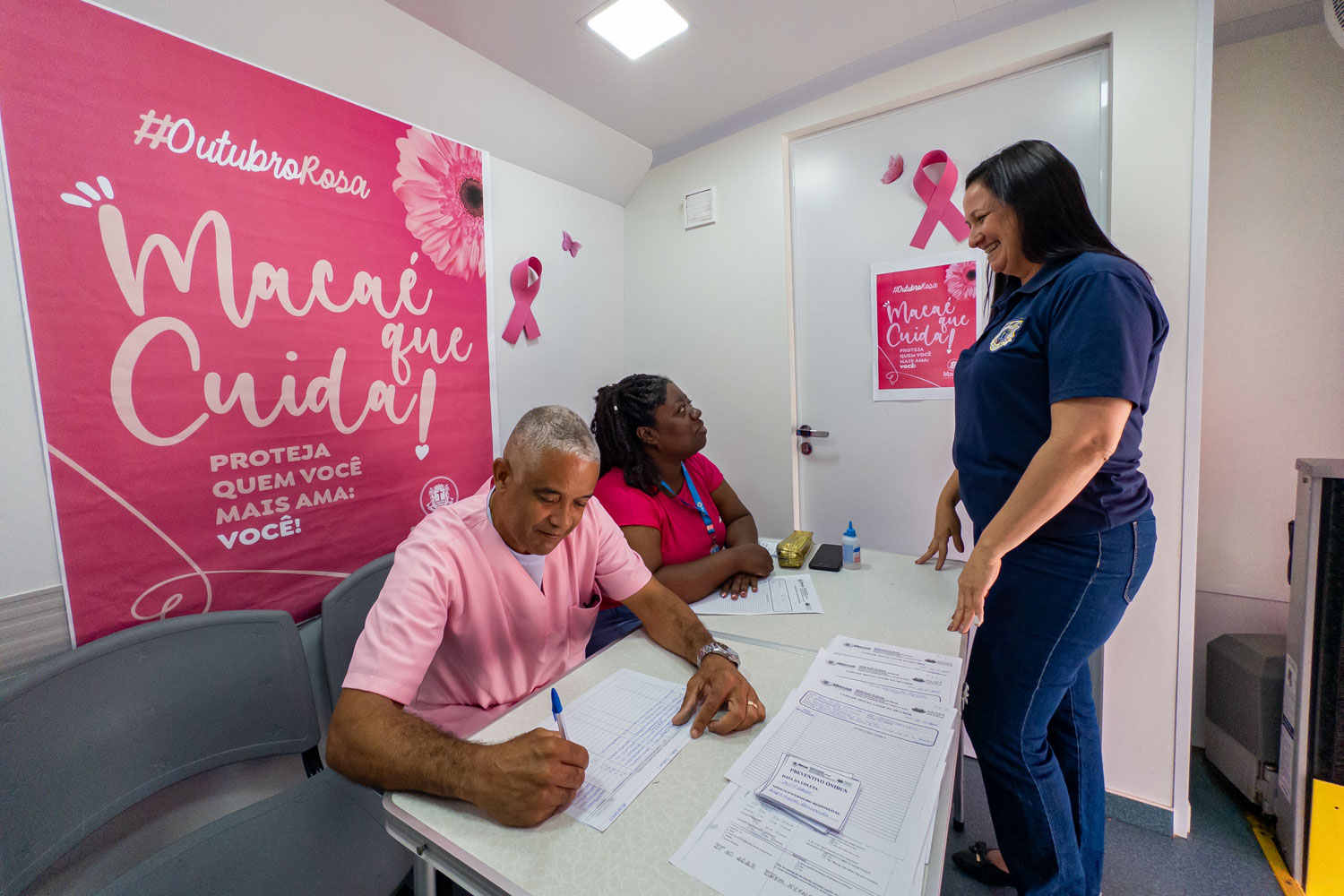 Com o objetivo de incentivar o cuidado com a saúde feminina e reafirmar o diagnóstico precoce como ação significativa para elevar as chances de cura do câncer de mama, a Secretaria de Saúde de Macaé, por meio do Programa de Assistência Integral à Saúde da Mulher, segue com diversas atividades ao longo de todo o mês em alusão ao ‘Outubro Rosa’. Nesta segunda-feira (20), a ação se volta ao atendimento das servidoras municipais das Secretarias de Segurança e Ordem Pública, utilizando como consultório o Ônibus Rosa itinerante, até às 16h.