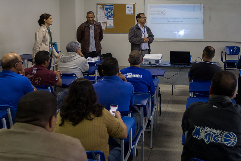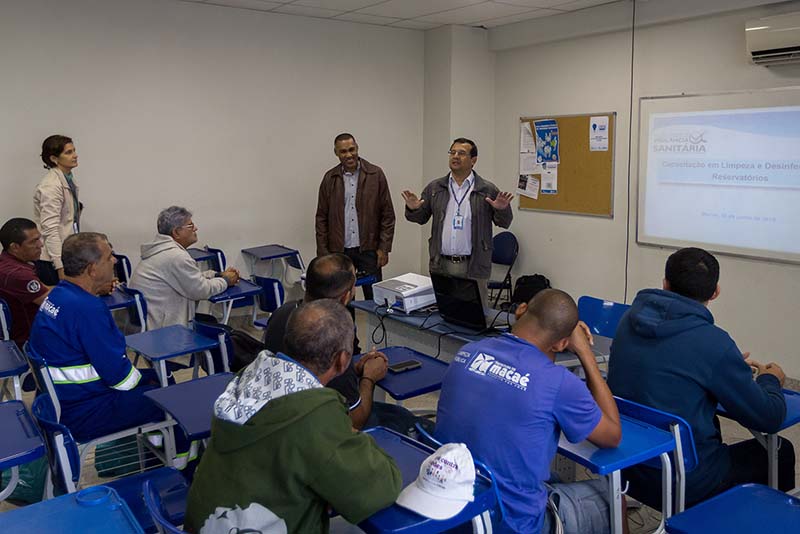 Na manhã desta sexta-feira (10), foi aplicada a parte teórica, onde os participantes conheceram noções básicas sobre qualidade da água de consumo humano, produtos a base de cloro, biossegurança na manipulação de produtos clorados, métodos de limpeza e desinfecção de reservatórios e segurança sanitária, além da manutenção dos recipientes. Durante a tarde, os profissionais aprenderam com a prática, executando a limpeza dos reservatórios da Fundação Educacional de Macaé (Funemac).