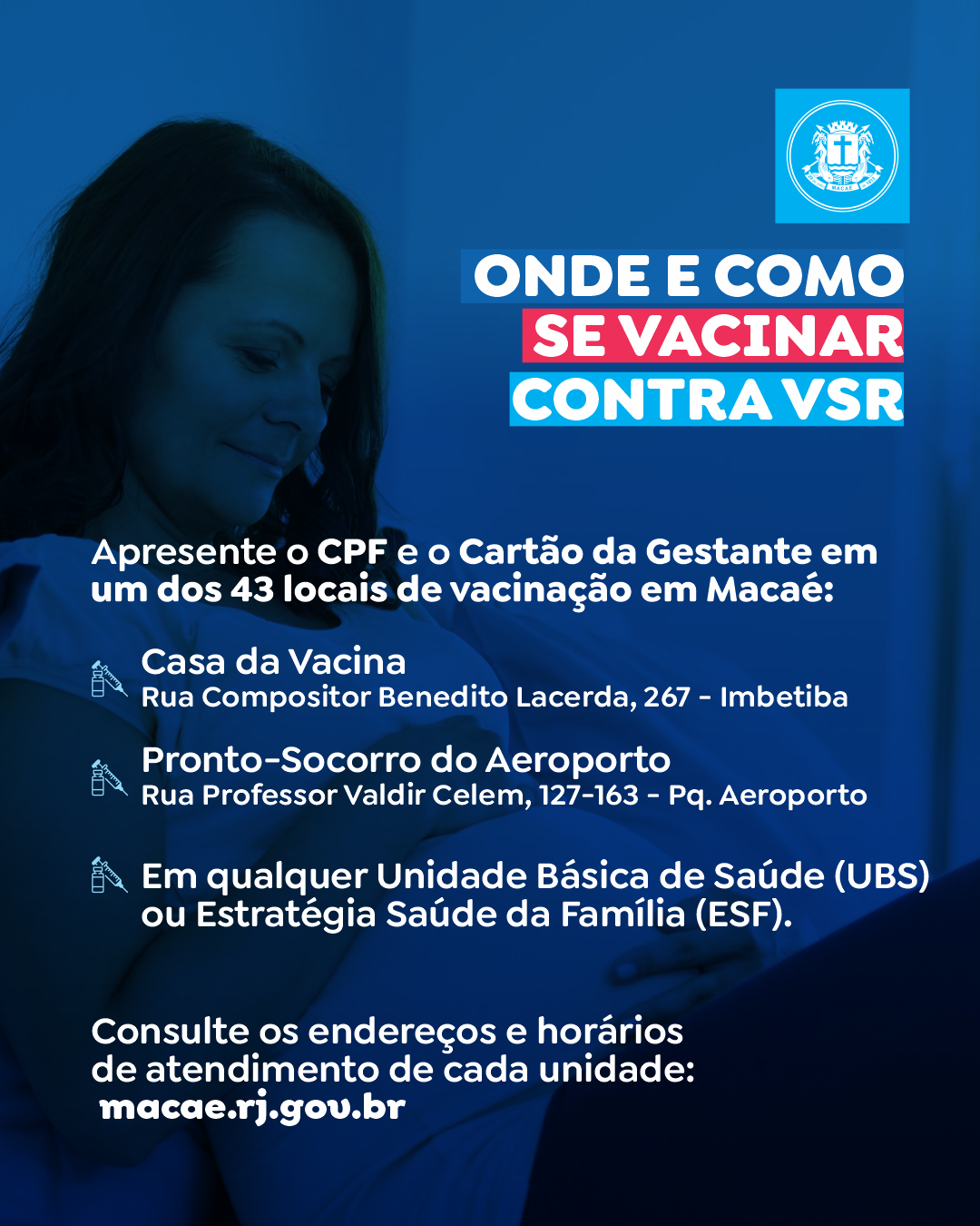 As gestantes de Macaé devem ficar atentas: todas as Estratégias de Saúde da Família (ESF) e Unidades Básicas de Saúde (UBS) do município estão abastecidas de vacina VSR. A partir desta segunda-feira (02), esse público alvo pode se dirigir à unidade de saúde mais próxima de sua casa para se imunizar contra o vírus sincicial respiratório (VSR), que é uma das maiores causas de infecções respiratórias em recém-nascidos e crianças pequenas, sobretudo, bebês.