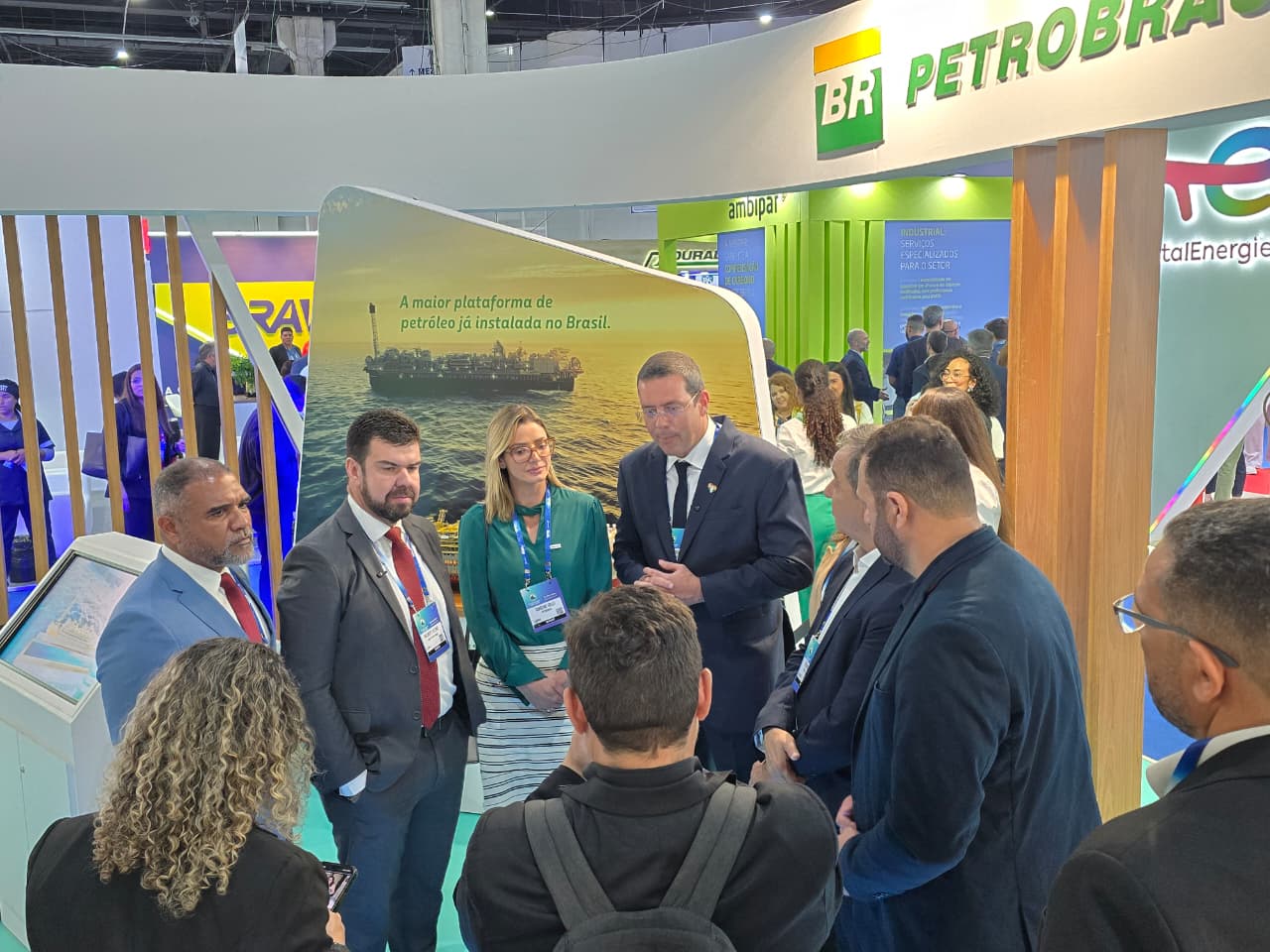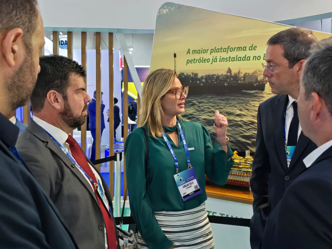 Durante a visita aos estandes da Offshore Technology Conference (OTC) Brasil, o prefeito de Macaé, Welberth Rezende, esteve no espaço da Petrobras, onde apresentou ao prefeito de Macapá (AP), Dr. Furlan, o funcionamento do processo de extração de petróleo e os impactos dessa atividade. Rezende ressaltou a relevância de Macaé no contexto da indústria offshore e a importância de trocar experiências sobre gestão e desenvolvimento entre municípios que atuam no setor energético.