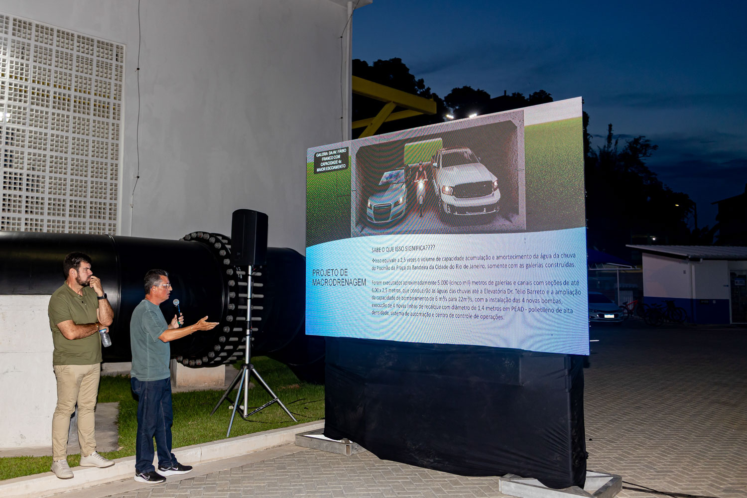 Ao lado do vice-prefeito Dr Fabiano Paschoal, secretários de Infraestrutura Santiago Borges, de Obras Felipe Bastos e vereadores, o Prefeito destacou detalhes do projeto em que foram executados aproximadamente cinco mil metros de galerias e canais com seções que conduzirão as águas das chuvas até a Elevatória Dr. Télio Barreto . Na ocasião , o secretário de Infraestrutura também mostrou imagens e dados; como a ampliação da capacidade de bombeamento de 6 m³/s para 22m³/s, com a instalação das quatro novas bombas, execução de quatro novas linhas de recalque, sistema de automação e centro de controle de operações.
