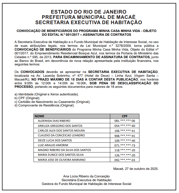 A Prefeitura de Macaé, por meio da Secretaria Executiva de Habitação, divulgou no Diário Oficial de 27 de outubro uma convocação de beneficiários do Programa Minha Casa Minha Vida, para assinatura dos contratos do Residencial Bosque Azul, referente ao Edital nº 001/2017. Trata-se de mais um avanço no processo de entrega de unidades habitacionais do município.
