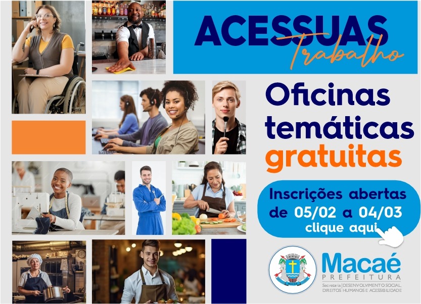 O programa de Promoção do Acesso ao Mundo do Trabalho - Acessuas abre inscrições, até dia 04 de março, para participação nas oficinas temáticas. Os interessados devem se cadastrar aqui. A prioridade é abranger qualificação profissional, acesso ao emprego formal e empreendedorismo. Serão 25 participantes em oficinas semanais com duração de 1h30.