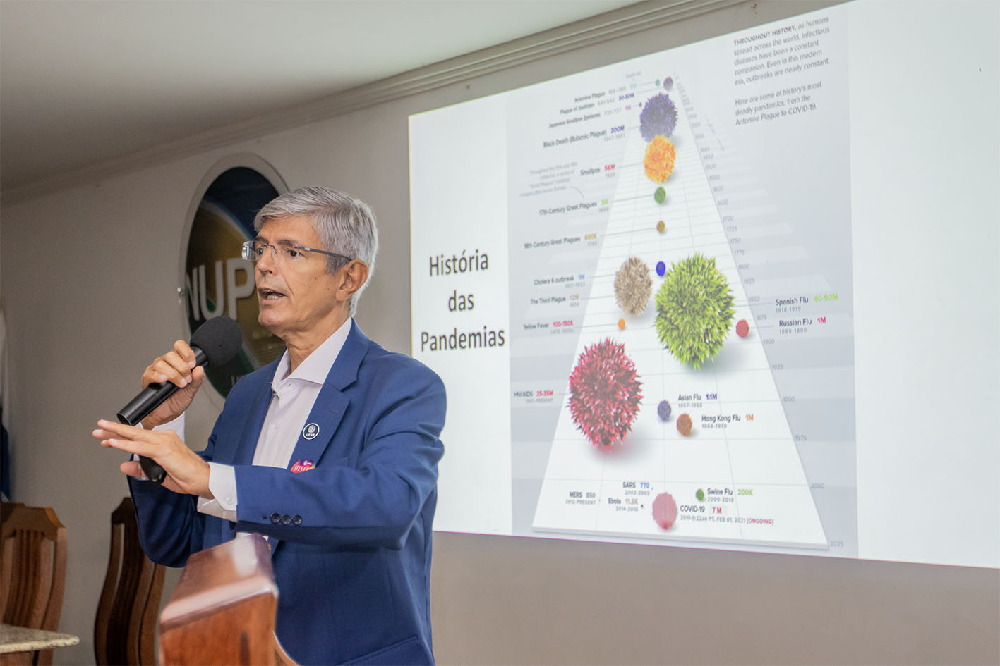 O tema da aula foi “Pandemias e IA”, em que o professor Roberto mostrou um pouco da história das pandemias no mundo, como a peste negra, gripe espanhola e a que assolou recentemente todo o mundo, a da Covid 19.